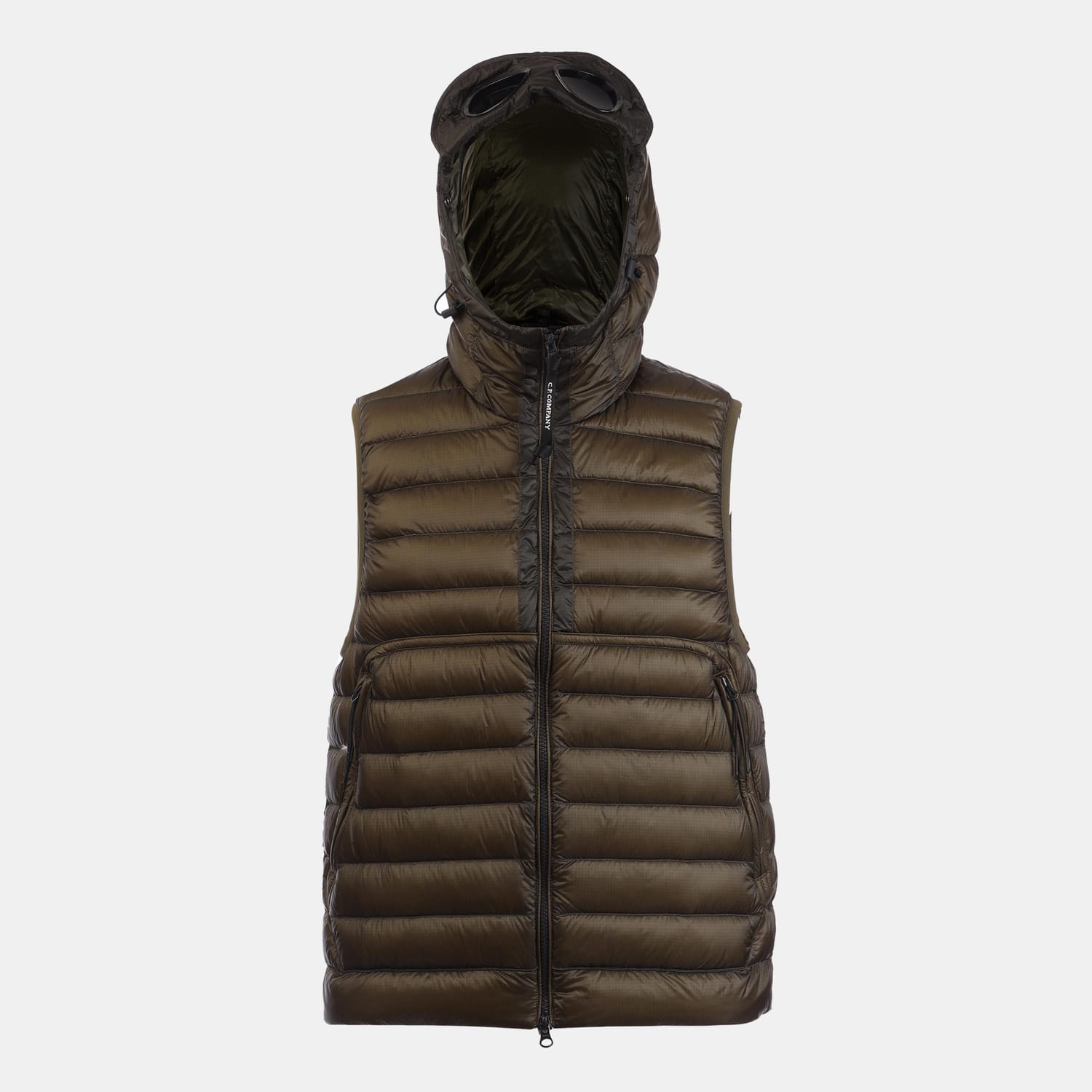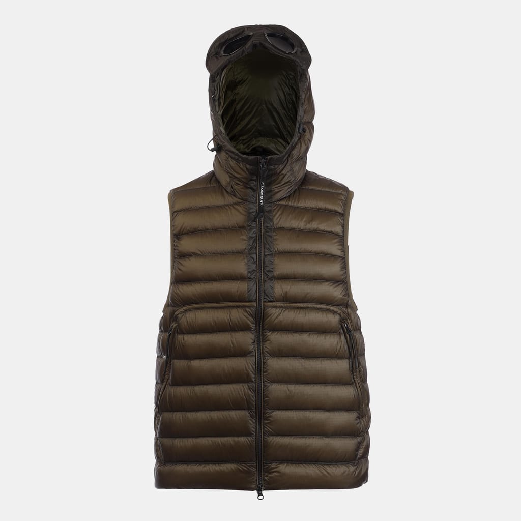 Mens C.P. Company D.D. Shell Google Down Gilet in green.