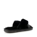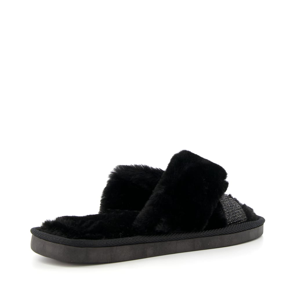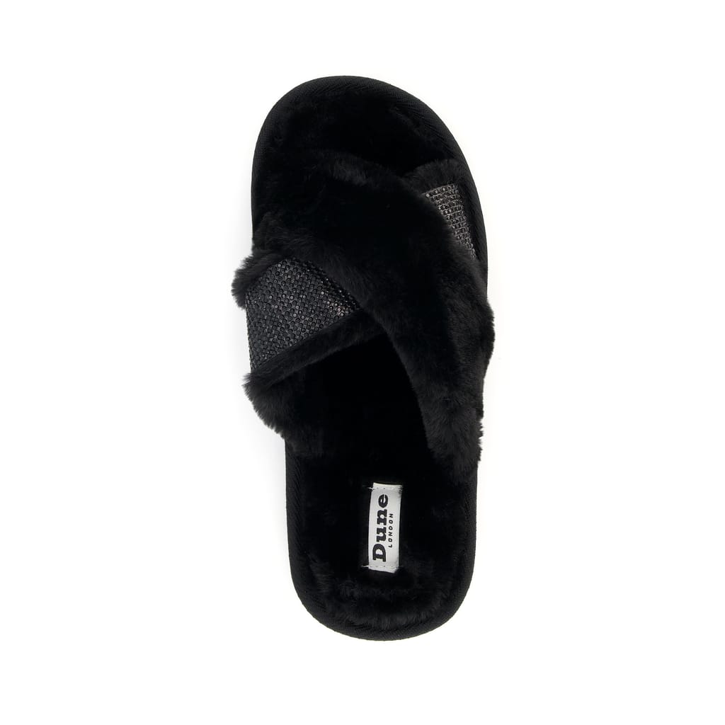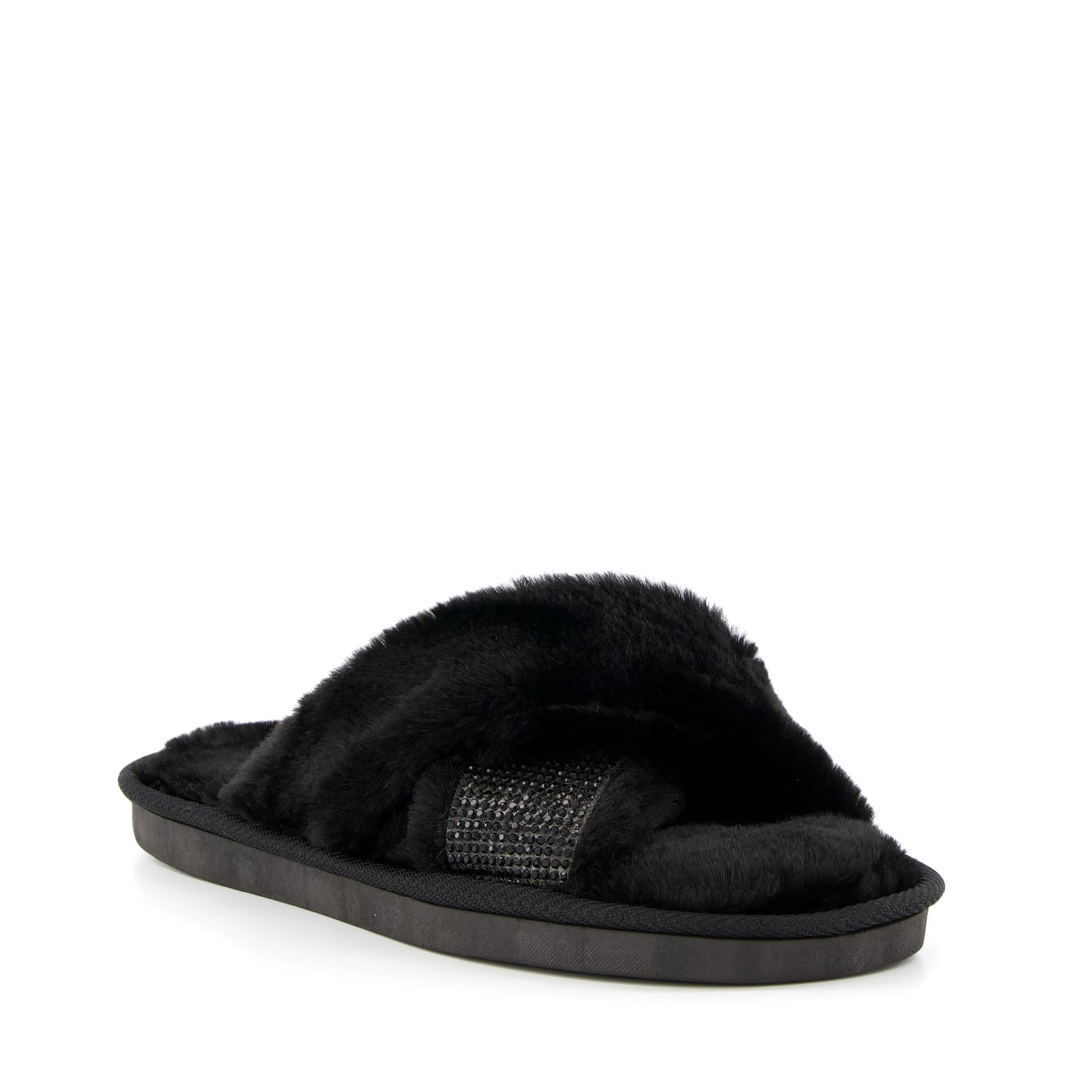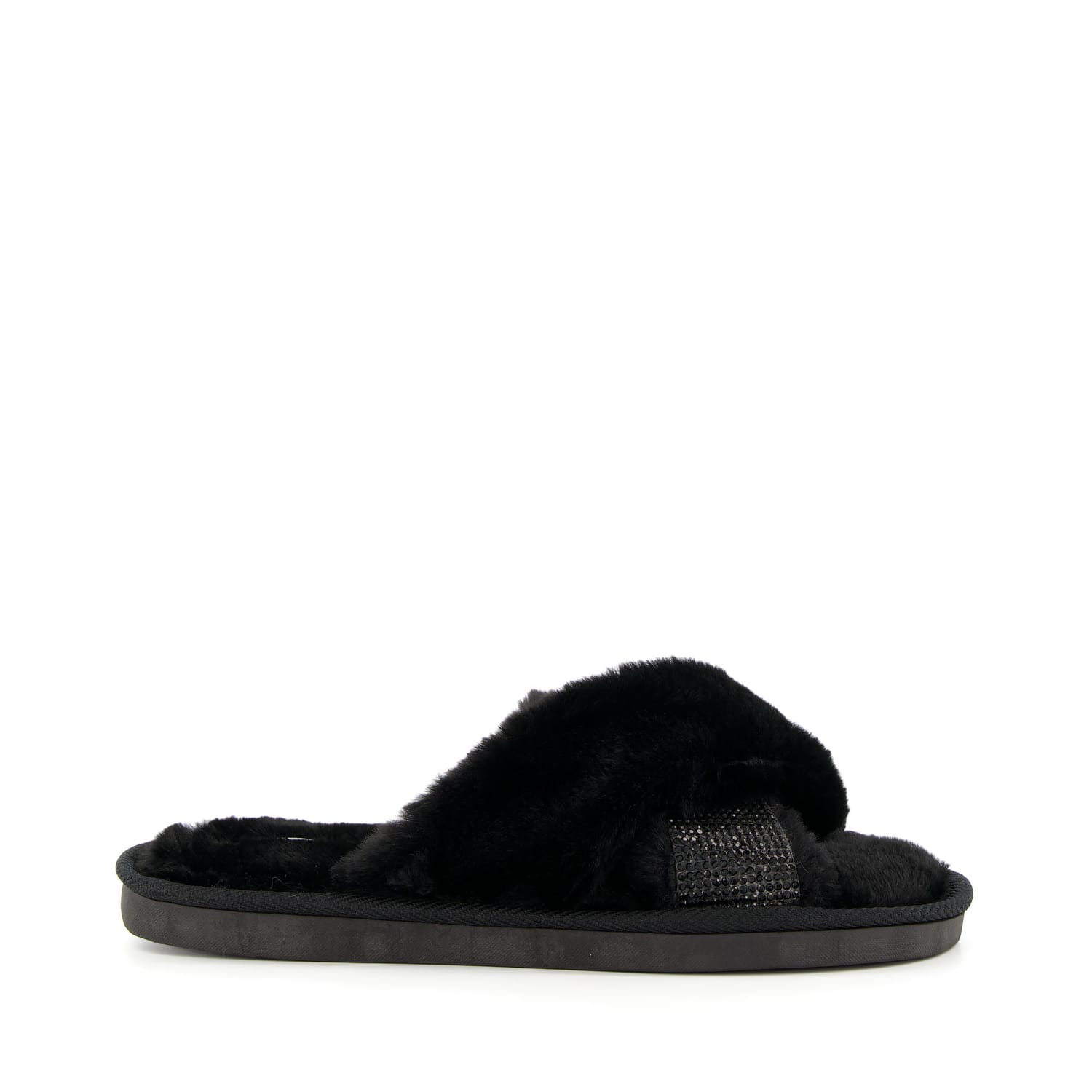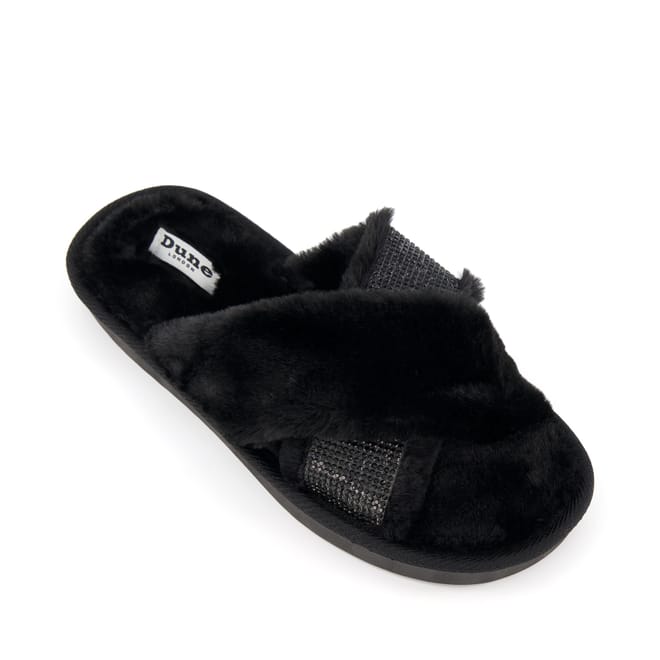 Synthetic textile upper with a faux fur lining. Winta, slip-on slider style with an open toe. Diamante rhinestones on one cross-over strap. -