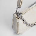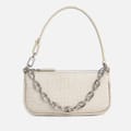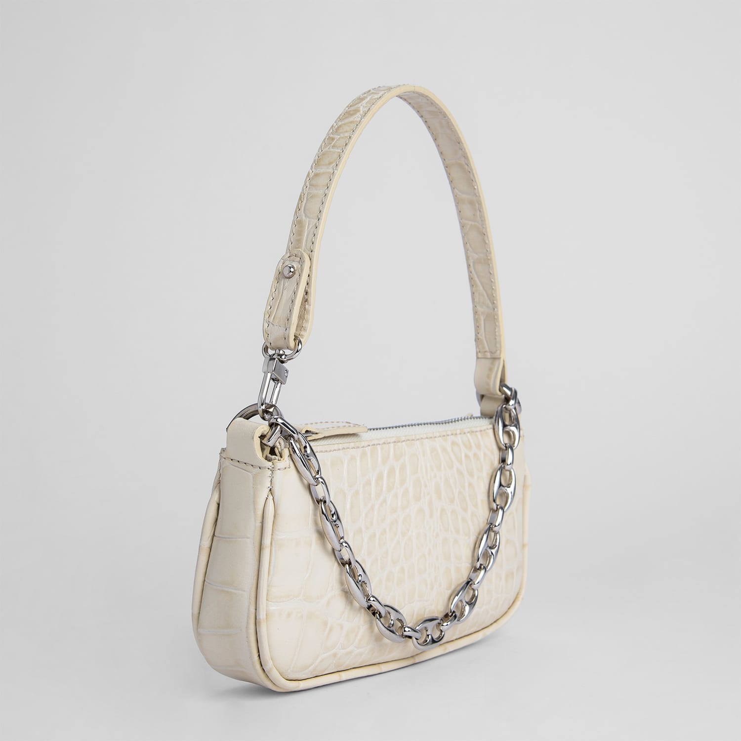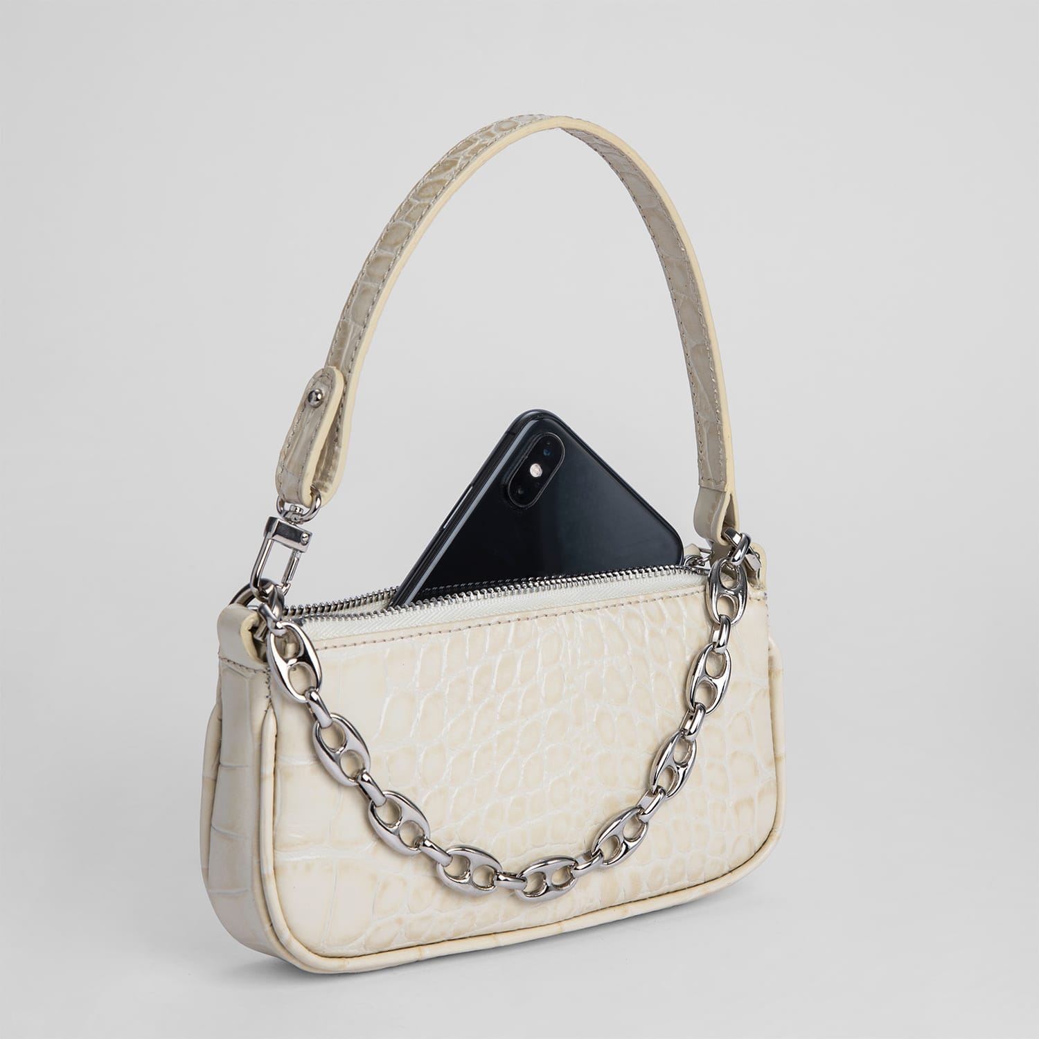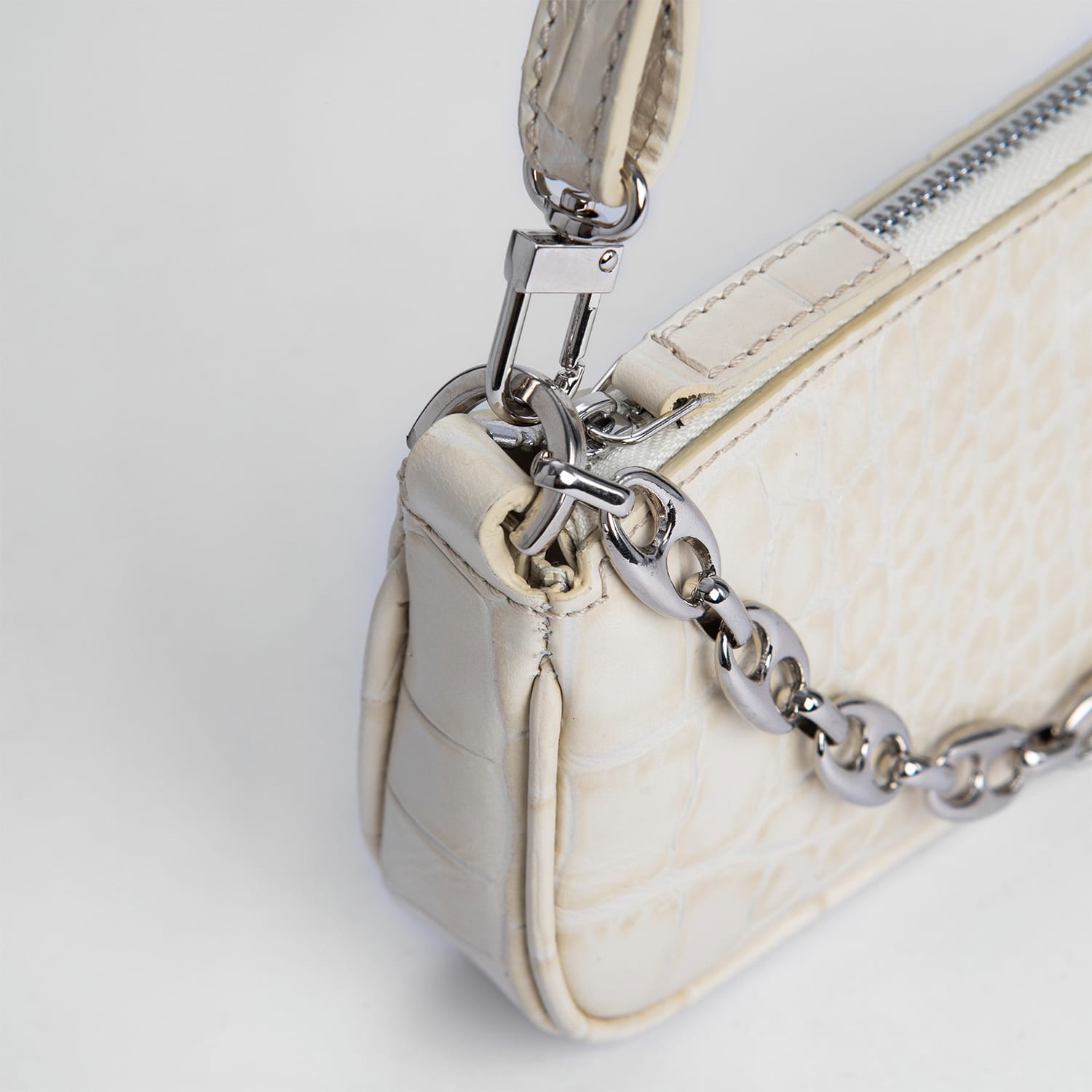 The bag features a single top handle, a decorative silver-tone chain on the front, and a top zip closure. The bag is made from cowhide leather with a croc-embossed finish -