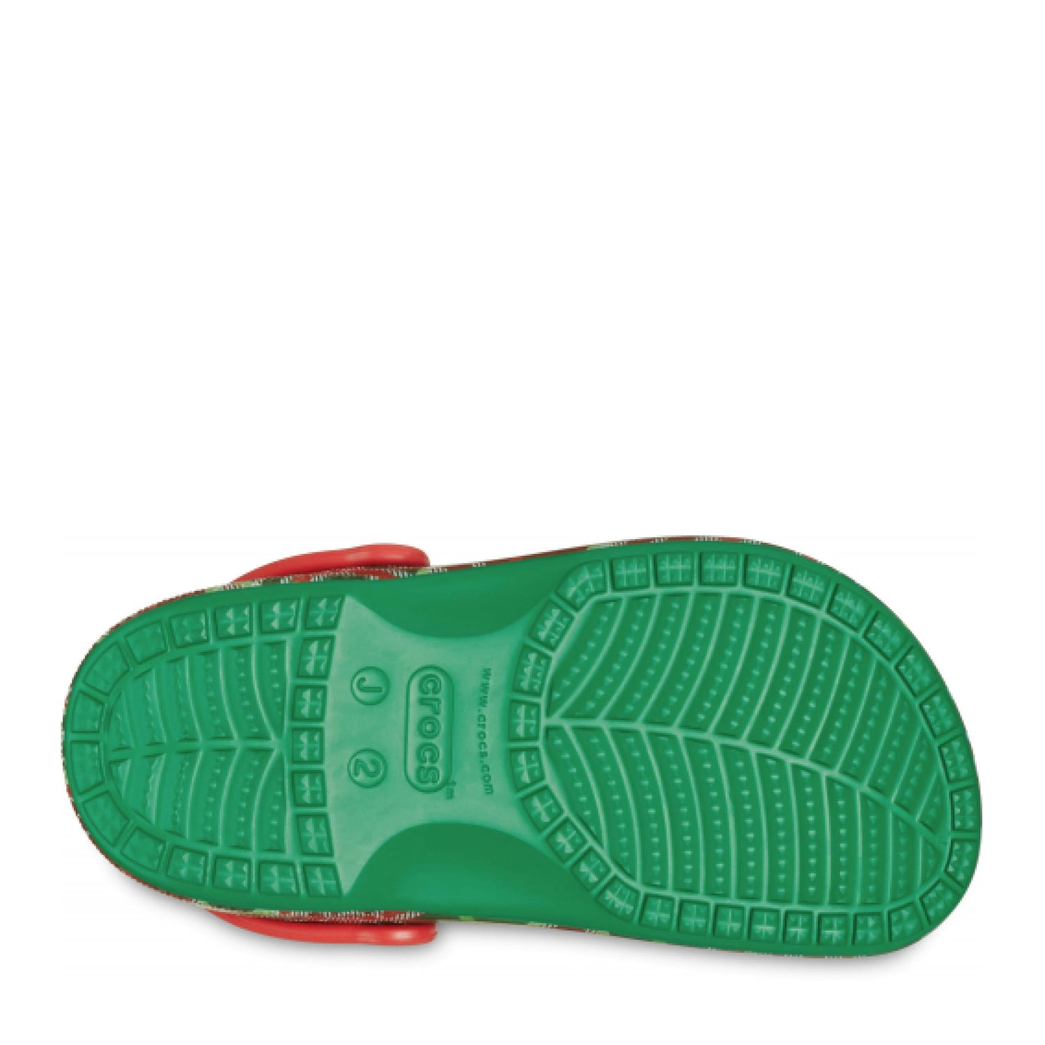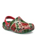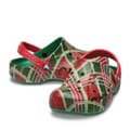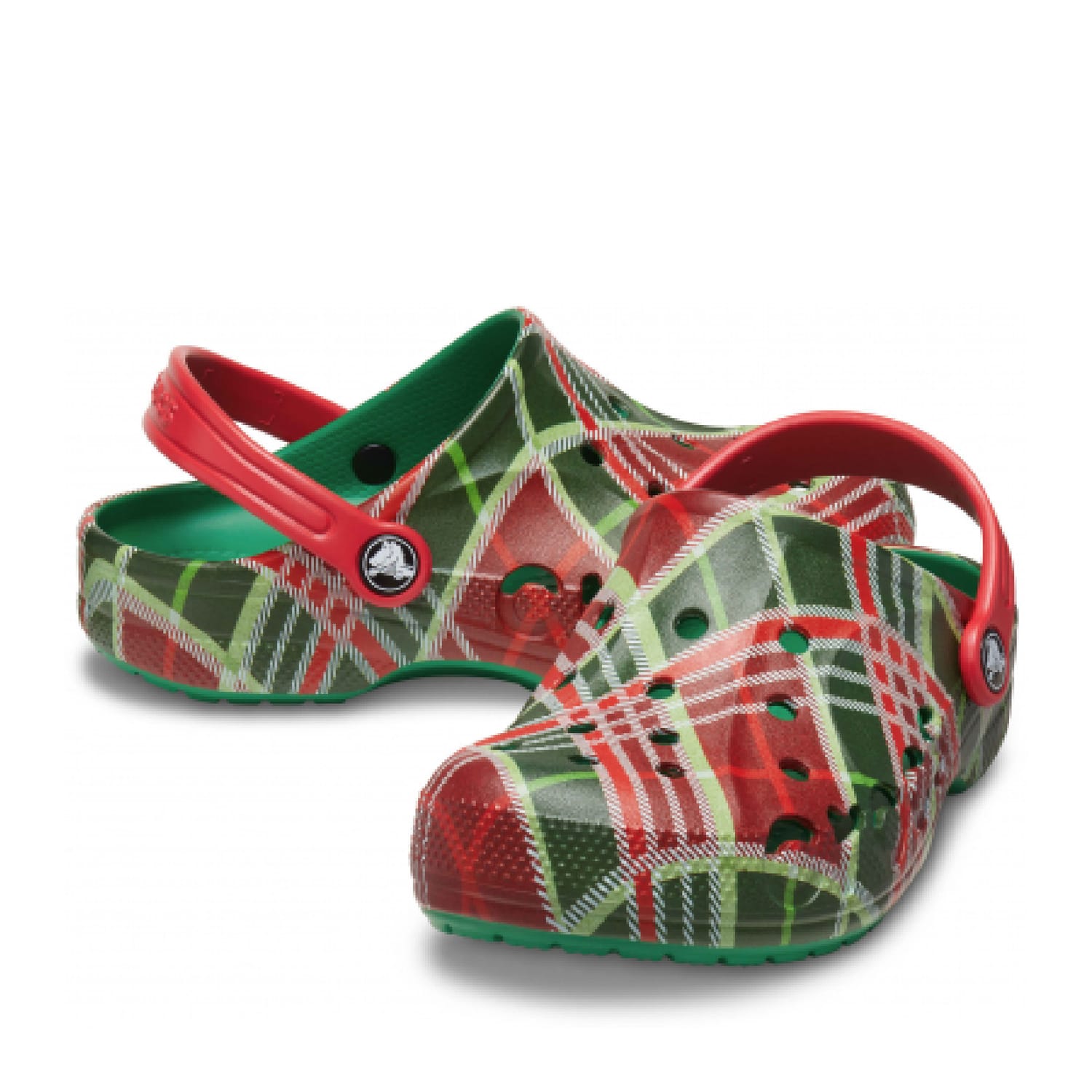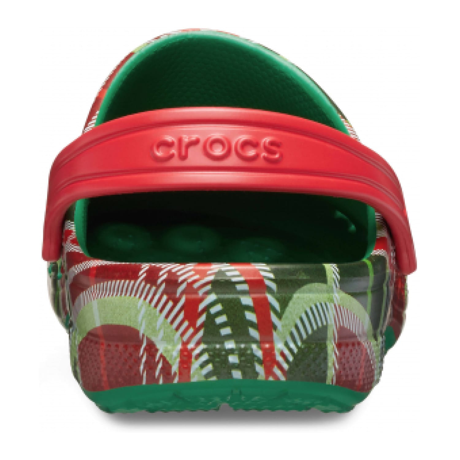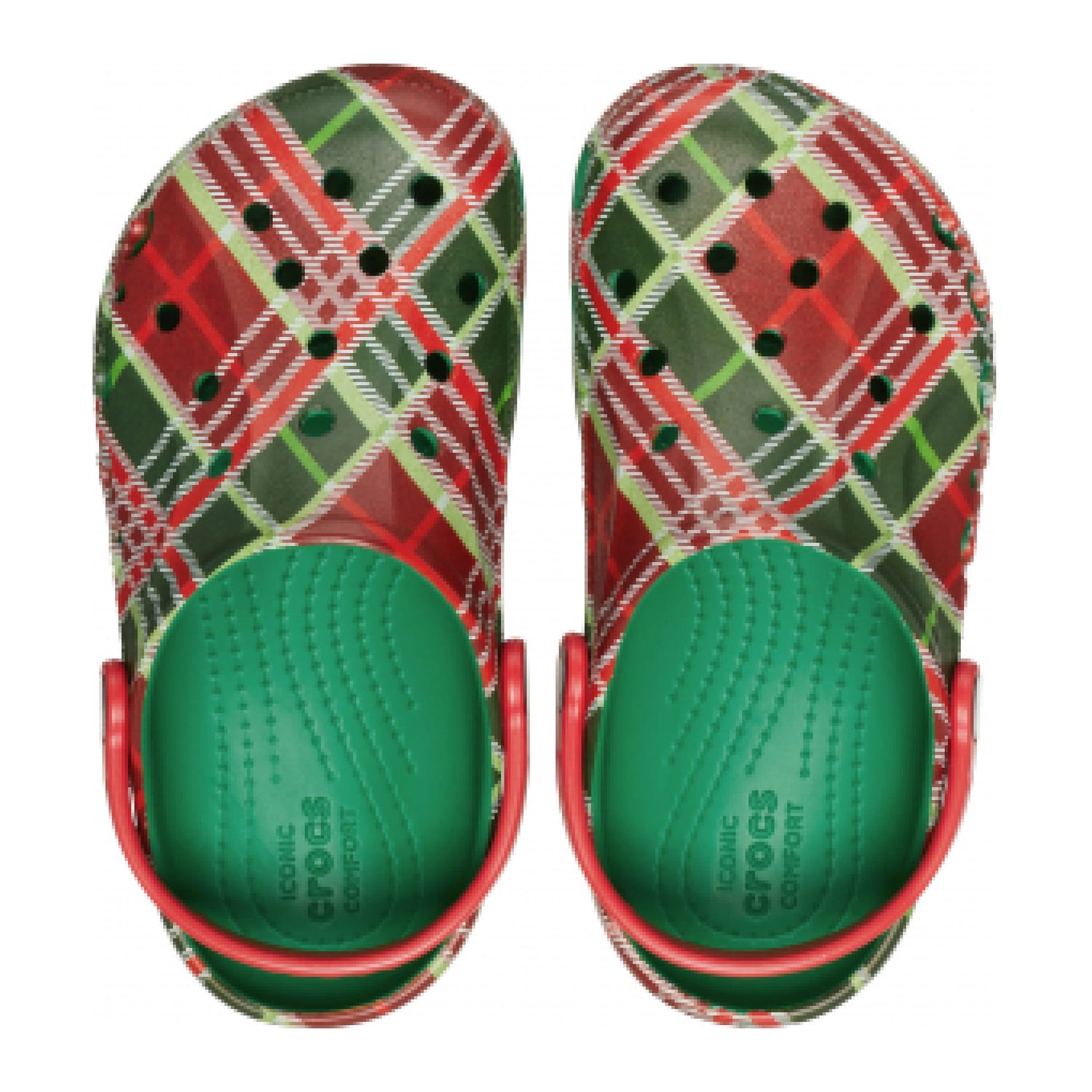 Made from Croslite™ foam for comfort and cushioning. Pivoting heel straps.Featuring a holiday plaid graphic reminiscent of wrapping paper. Water-friendly and buoyant. Customizable with Jibbitz™ charms. -