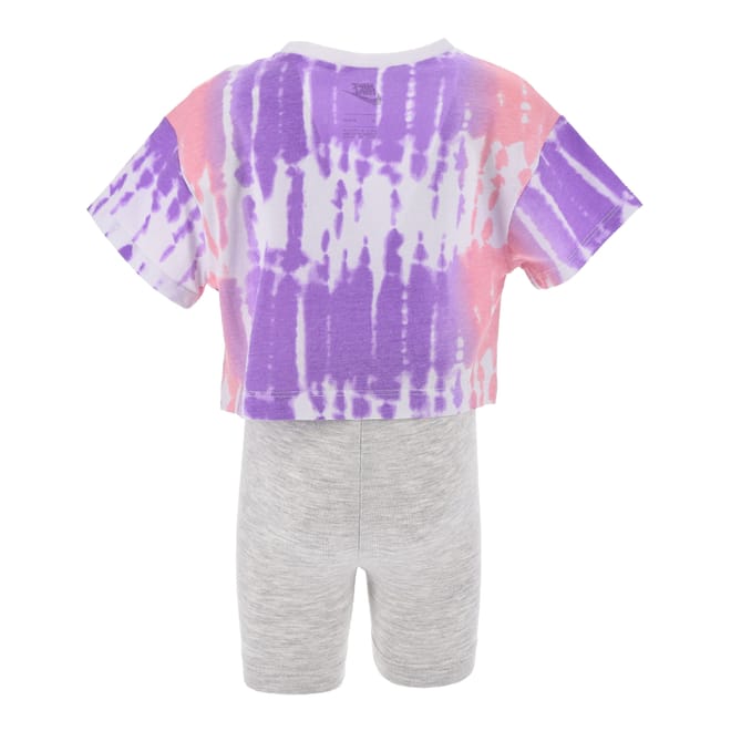 Ribbed crewneck. Short sleeves. Tie-dye pattern in purple and pink with a blue Nike logo. Elasticated waistband. Small blue logo on the leg. -