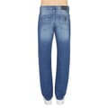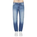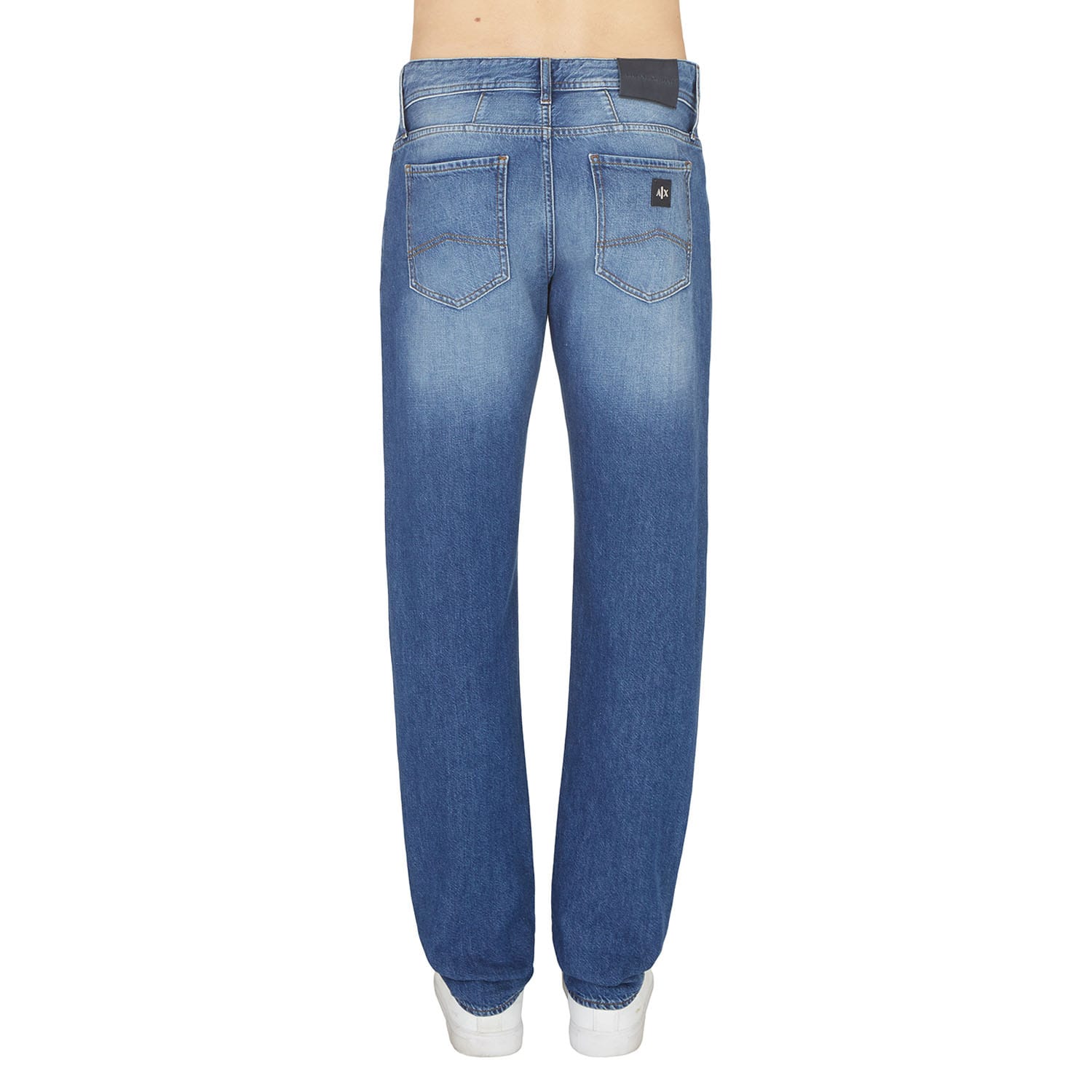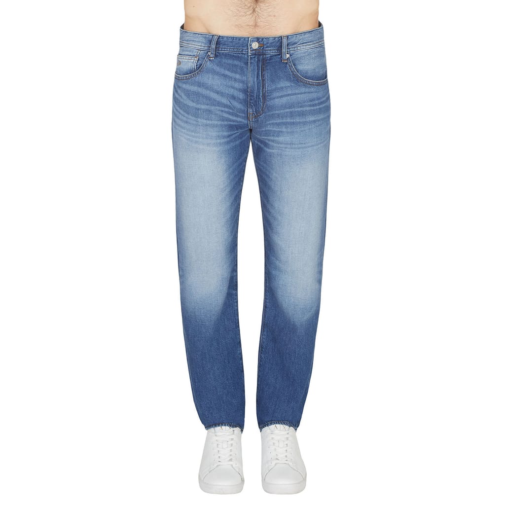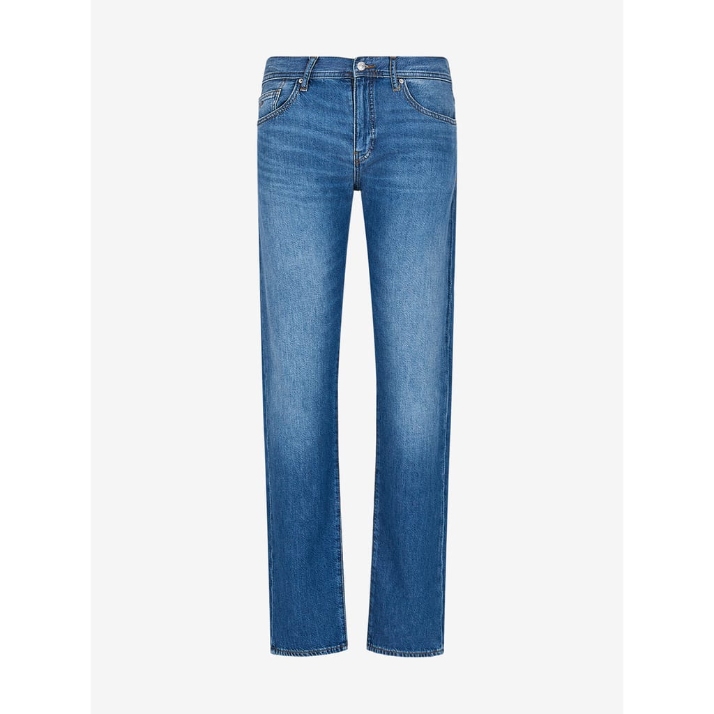 A metal zip fly with a branded metal top button in silver and five belt loops on the waistband. A classic five pocket design with two pockets on the hips featuring a small coin pocket within the right hip pocket and two pouch pockets on the reverse of the jeans. The signature Armani Exchange AX logo is embroidered on the coin pocket in beige and the signature Armani Exchange leather and metal stud logo patch is situated on the reverse right pocket in black and silver. The large signature Armani Exchange leather patch is situated on the reverse right of the waistband. -