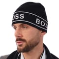 BOSS Ulfino Scarf And Hat Set In Black A two piece set featuring a beanie hat and a scarf. The beanie features a turn up design and the signature BOSS logo is woven and repeated in white. The scarf also features the signature BOSS logo woven and repeated in white with the signature BOSS HUGO BOSS leather logo patch situated on one end and this scarf measures 64 inches. The products are presented in a BOSS HUGO BOSS gift set. -