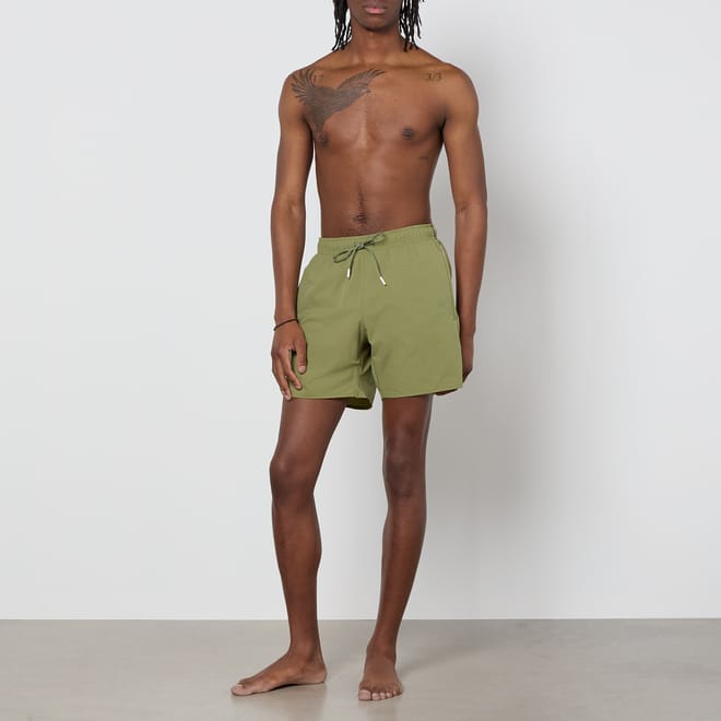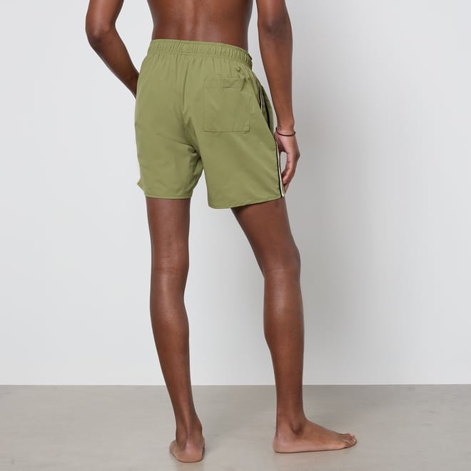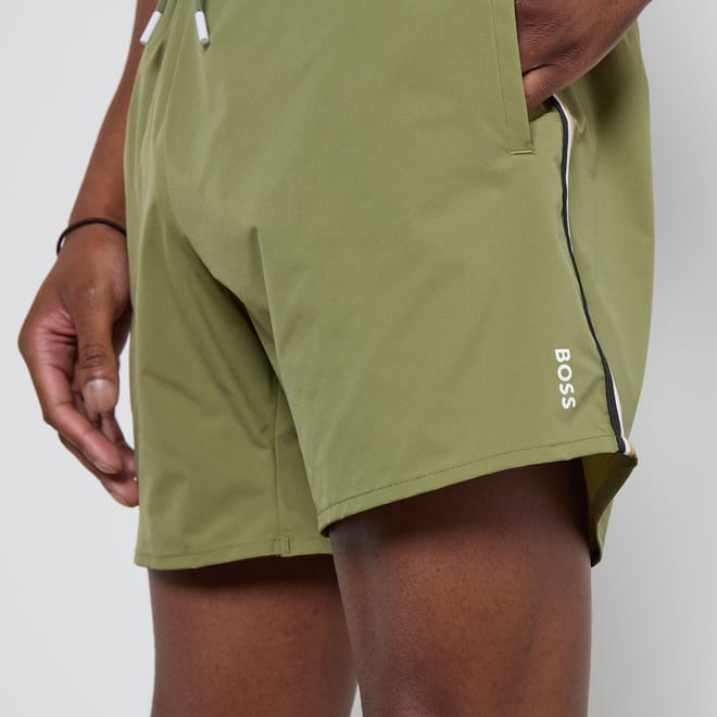Mens BOSS Iconic Recycled-material swim shorts with logo and signature stripe in green.