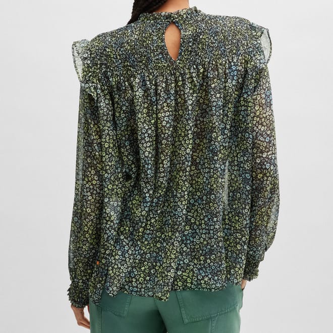 Light casual blouse/ volant detail at the shoulders and in the round collar/ long sleeves/ smock stitching details at front upper part and in the cuffs/ back keyhole closure with button/ in a light printed fabric -