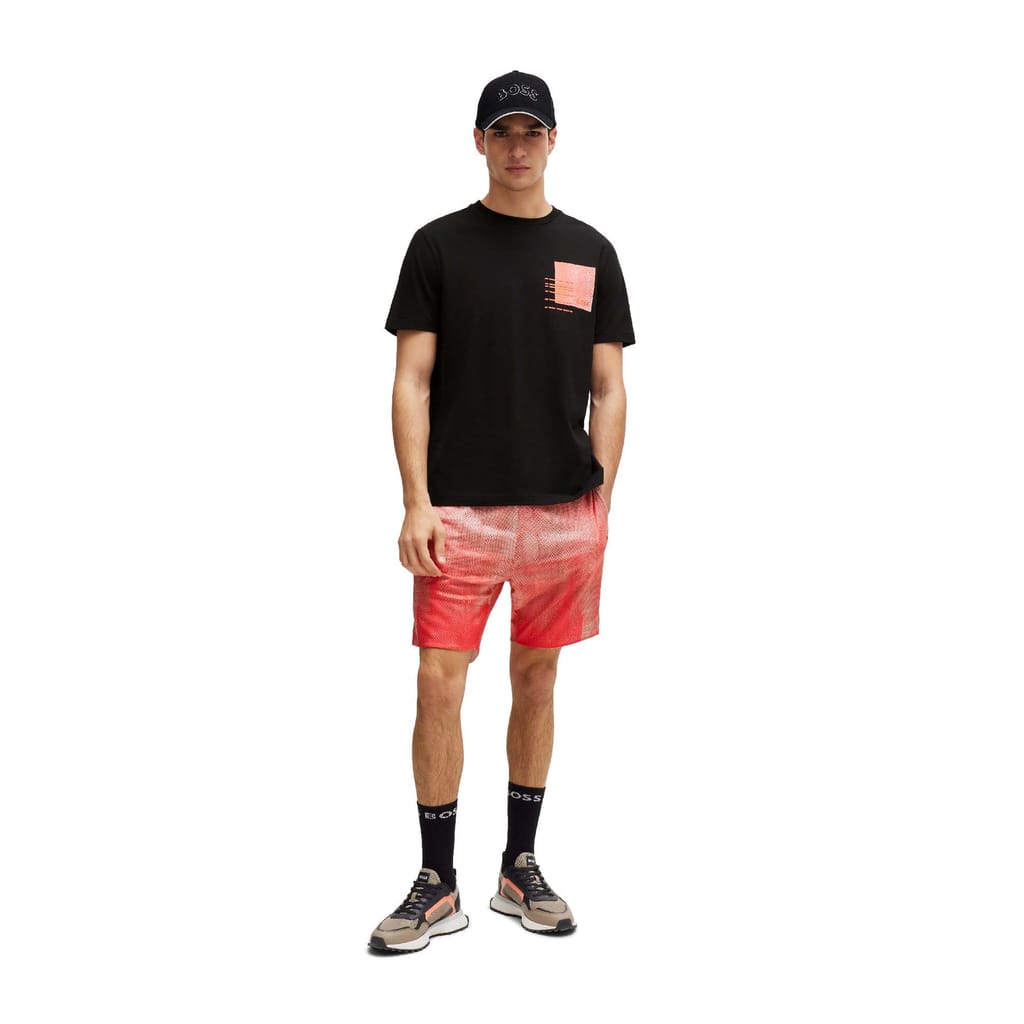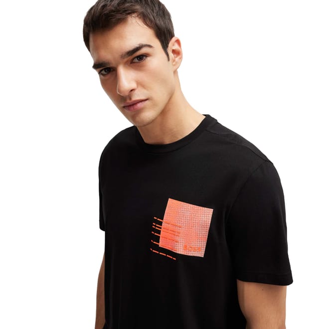 A casual T-shirt cut to a regular fit in a responsible-cotton blend with seasonal artwork front and back by BOSS Menswear.