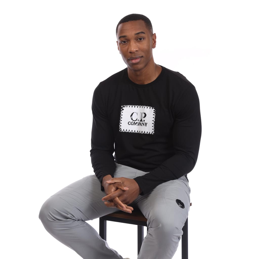 Mens C.P. Company Long Sleeve Logo Label T-Shirt in black.