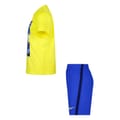 The t-shirt has a pixelated football graphic print on the front with "NIKE" text above and below the graphic. The shorts have an elastic waistband and a small yellow Nike swoosh logo on the lower left leg. Features Dri-FIT technology, which wicks sweat away from the body. The t-shirt is made of interlock knit fabric (likely a cotton/polyester blend), and the shorts are polyester mesh. -