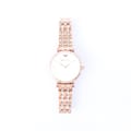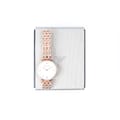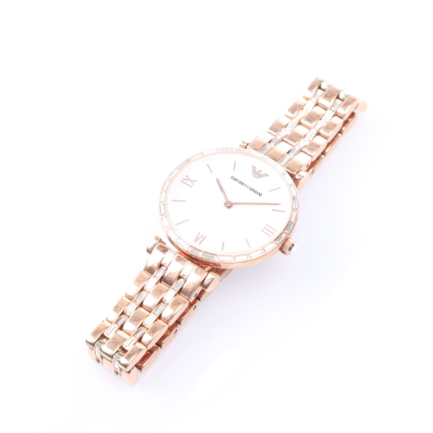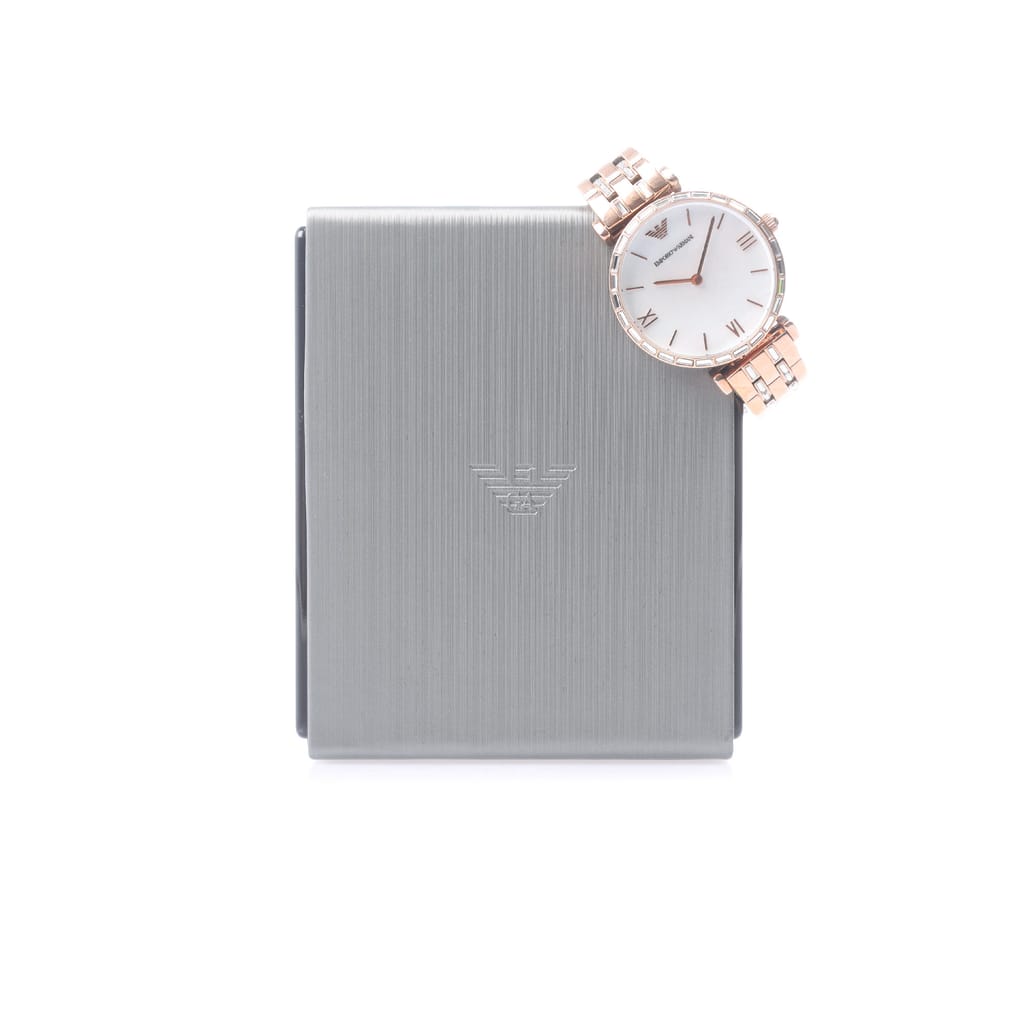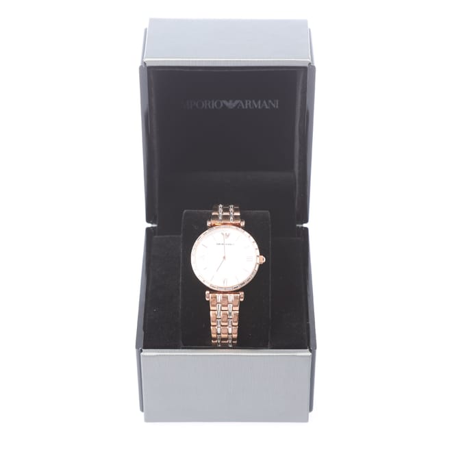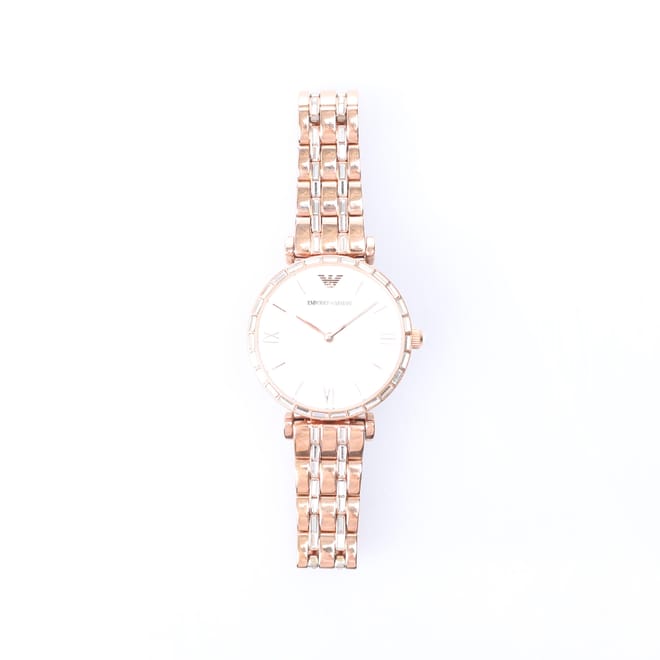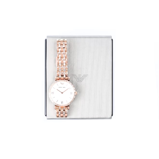 Emporio Armani's 32mm watch features a white mother-of-pearl dial with rose gold-tone Roman numeral and stick indexes, two-hand movement and rose gold-tone steel bracelet with baguette-stones on the center links. Packed in a Emporio Armani gift box -