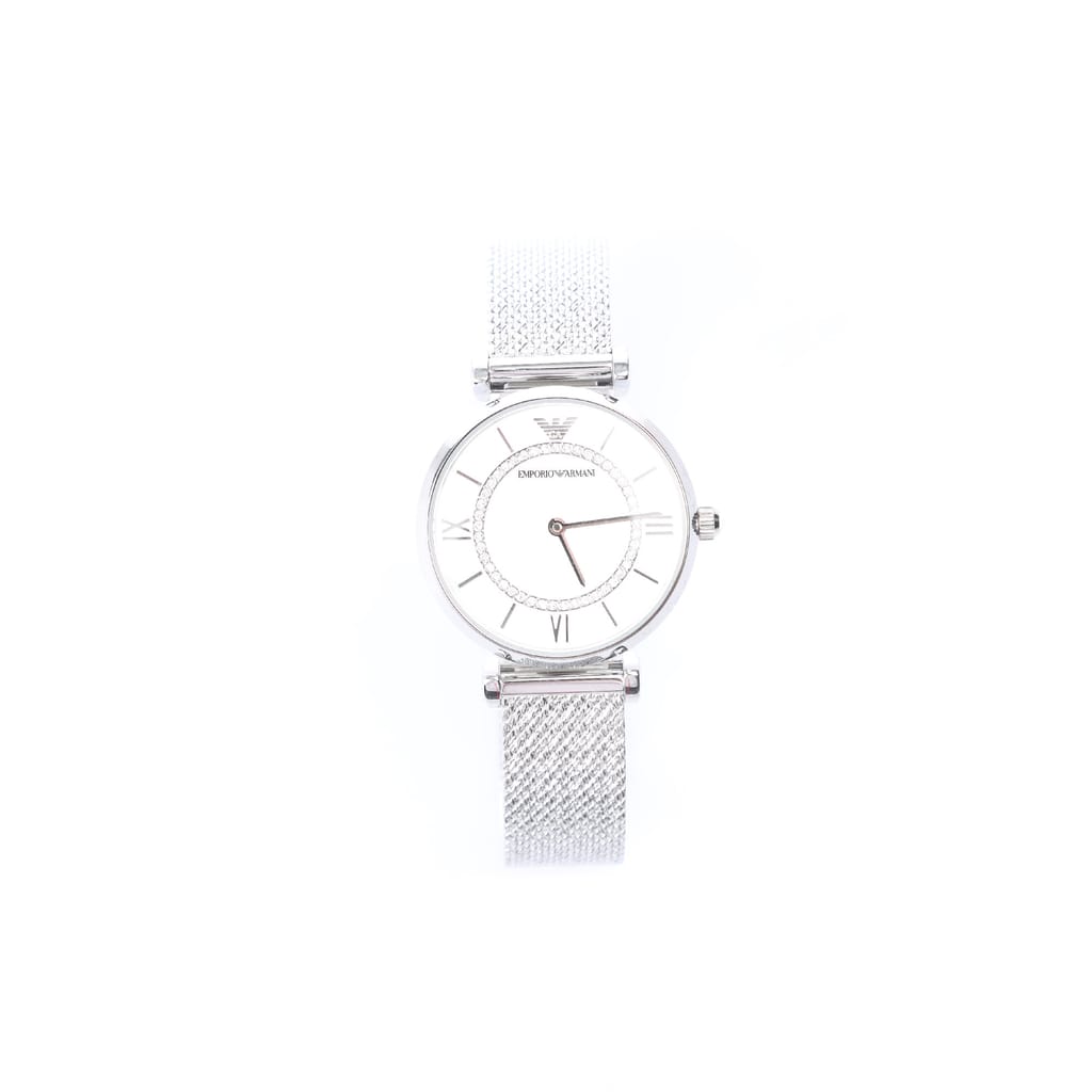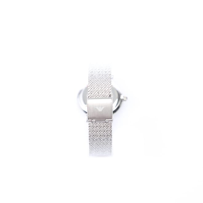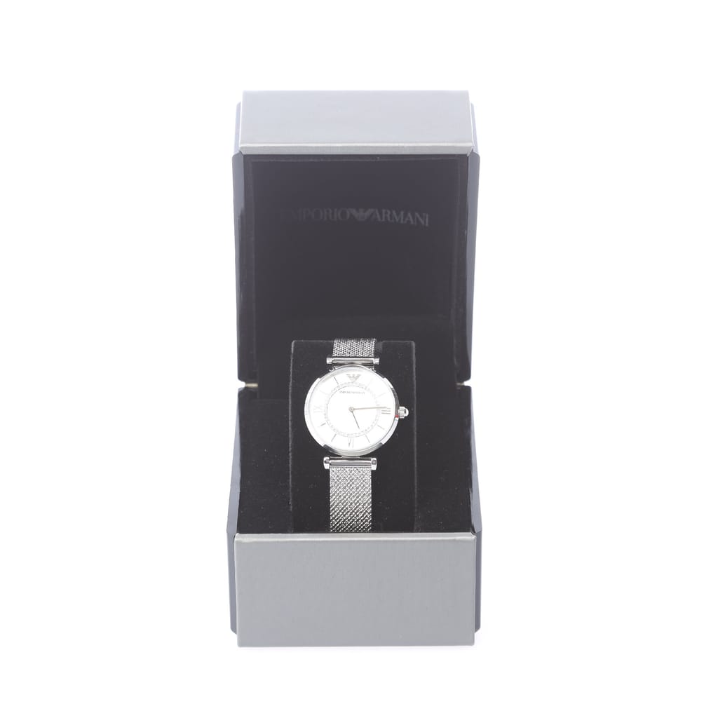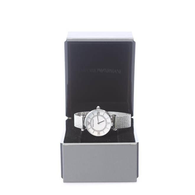 Stainless steel case and mesh strap, both in a silver tone. Water-resistant up to 30 meters (100 feet). Glass: Scratch-resistant mineral crystal. Case Size: 32mm diameter and 8mm thickness. -