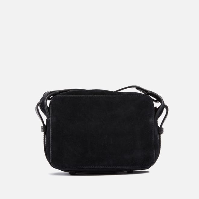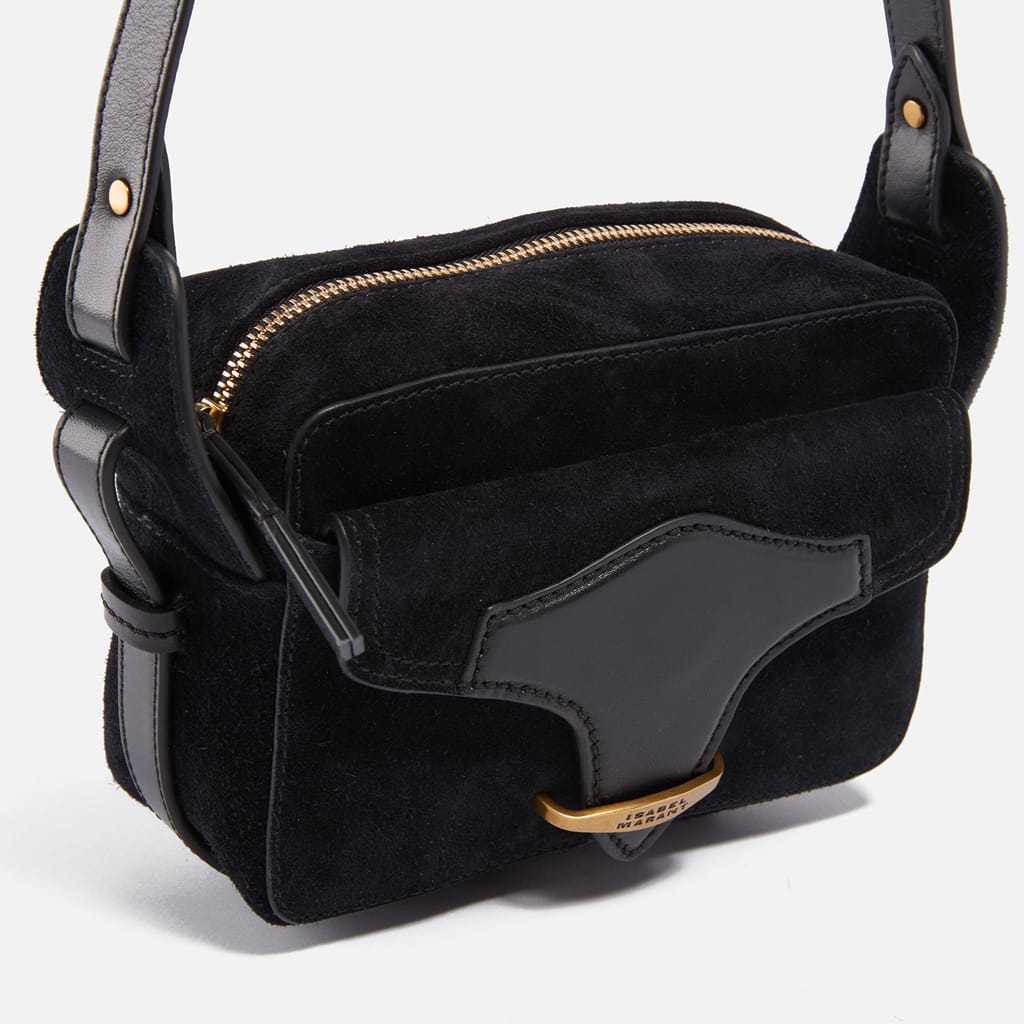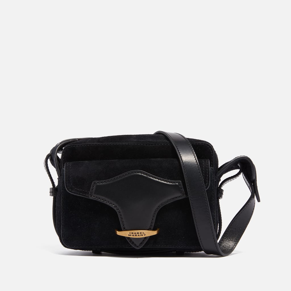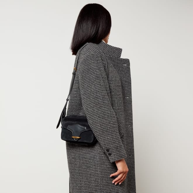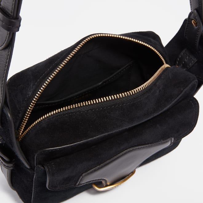 The bag features a panelled design of suede and leather, a gold-tone logo plaque, and an adjustable shoulder strap. It has a top zip fastening and a front pocket with a slip-tab closure inspired by saddle bags. -