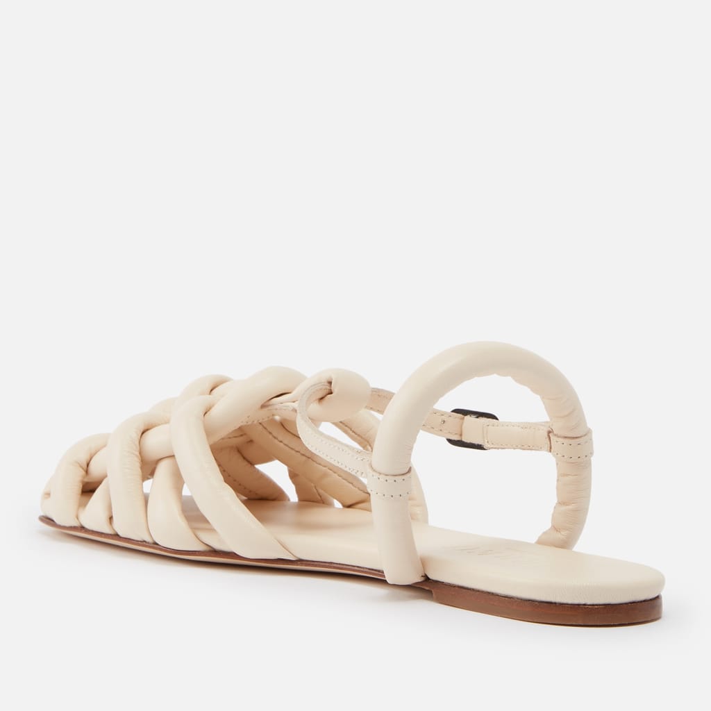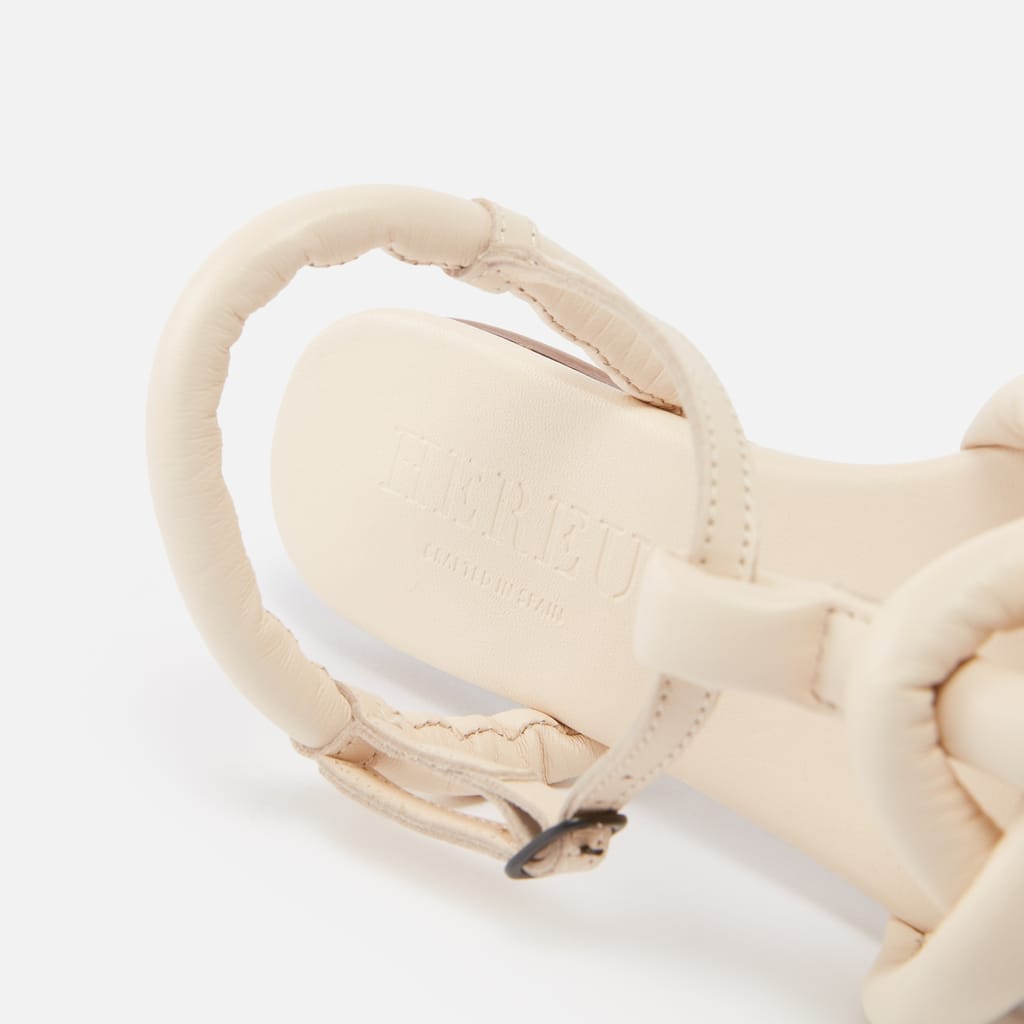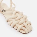 Woven leather straps and an ankle strap with a buckle closure. Leather soles. -