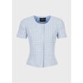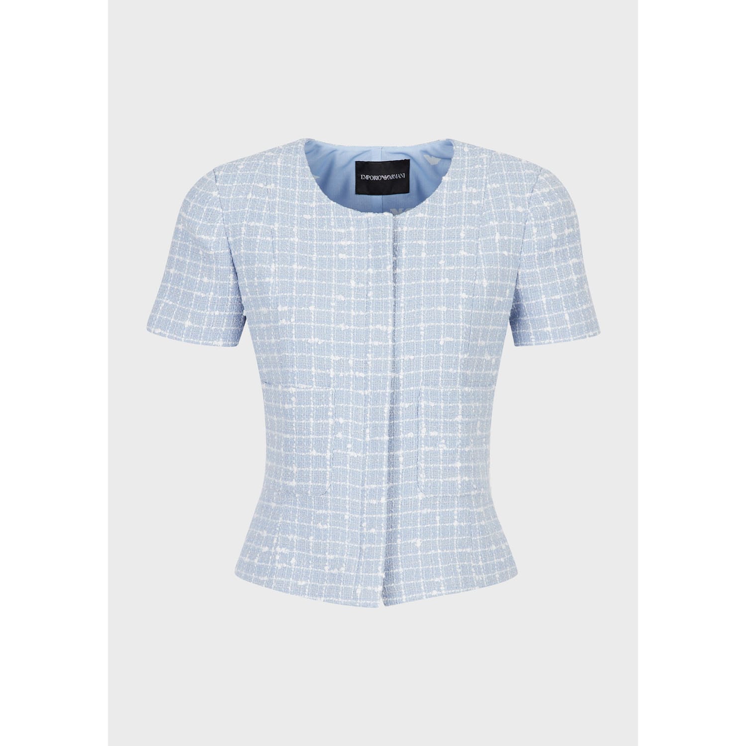 Crew neckline. Short sleeves. Hidden zip front closure. Front patch pockets. Checked tweed pattern. -