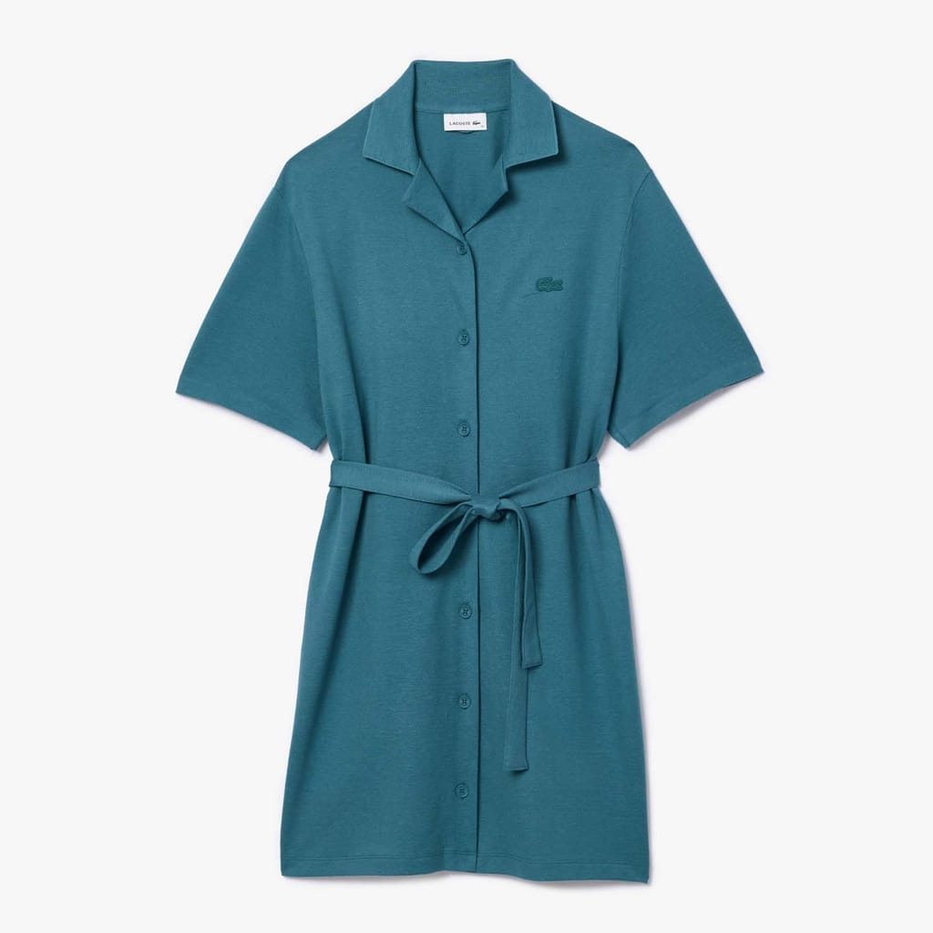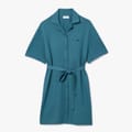 Womens Lacoste Linen and Cotton Belted Shirt Dress in hydro blue.
