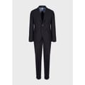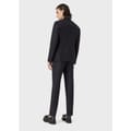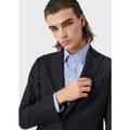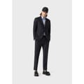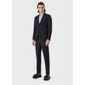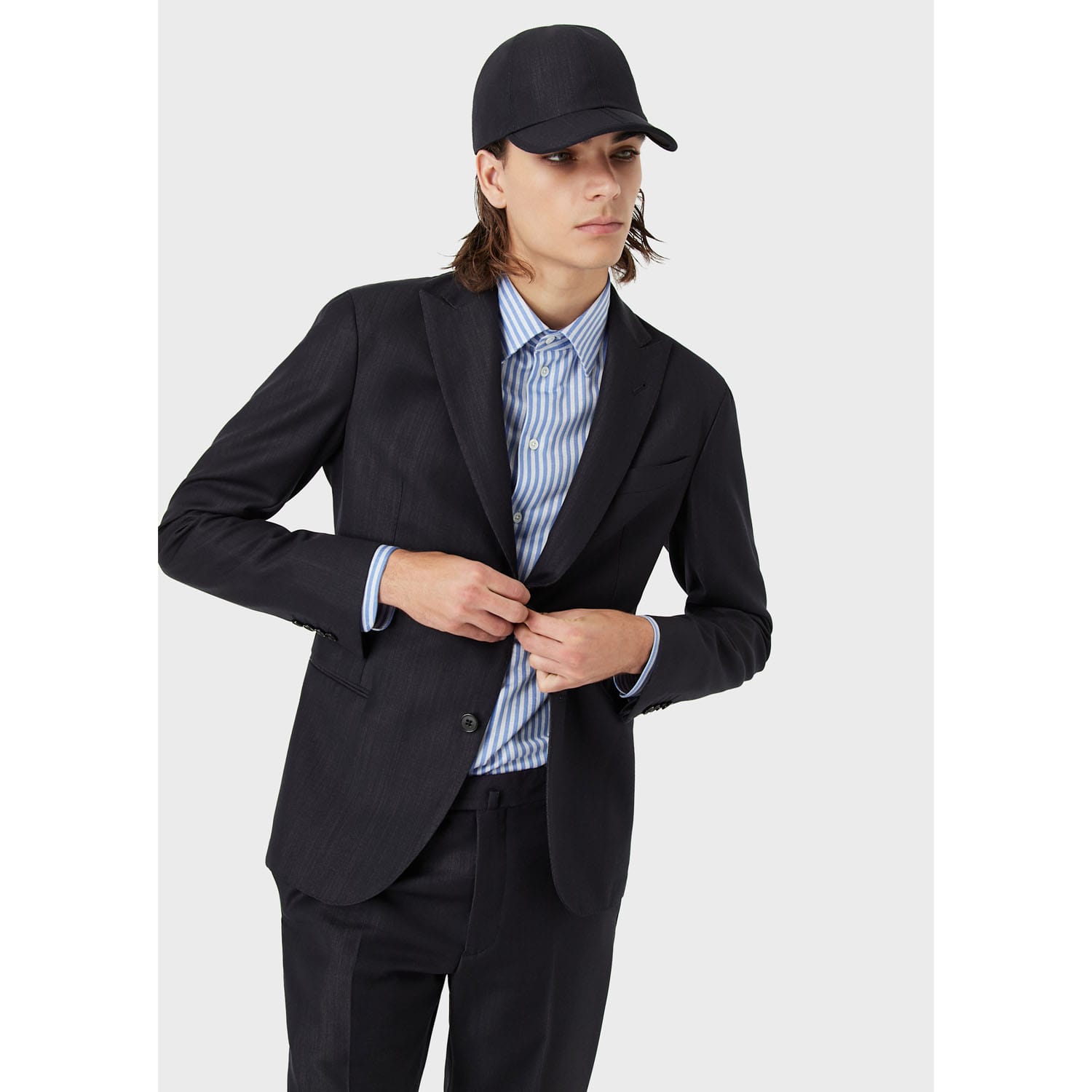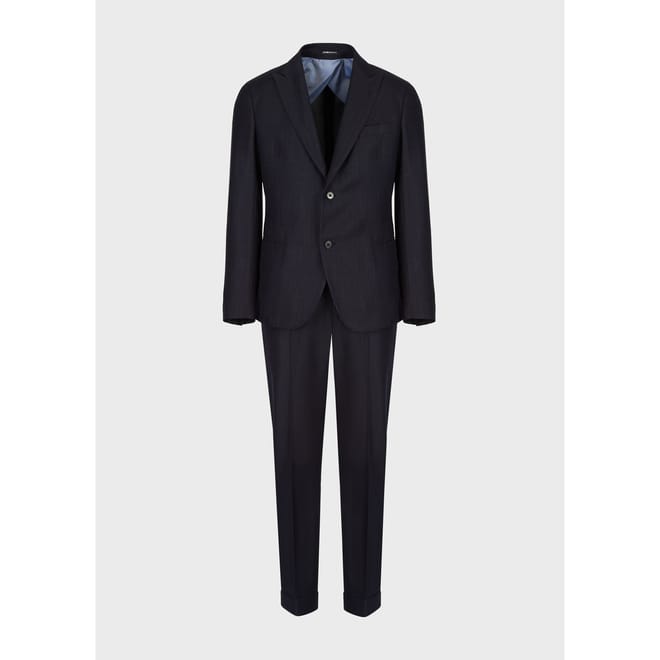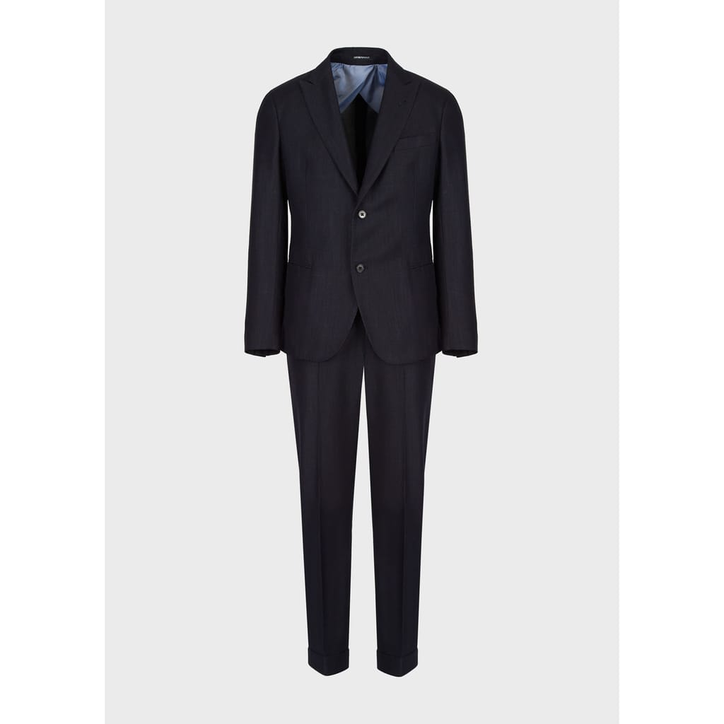 The suit typically has a two-button jacket with notched lapels and matching straight-leg trousers. Regular-fit, single-breasted suit in a material such as virgin wool. -