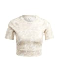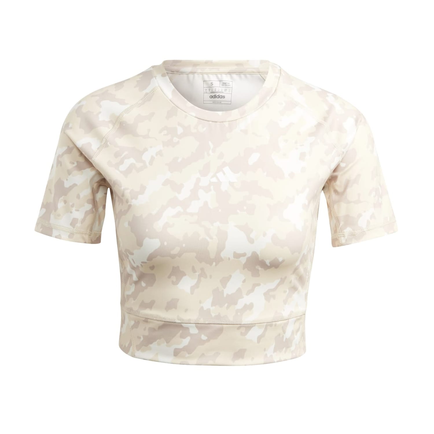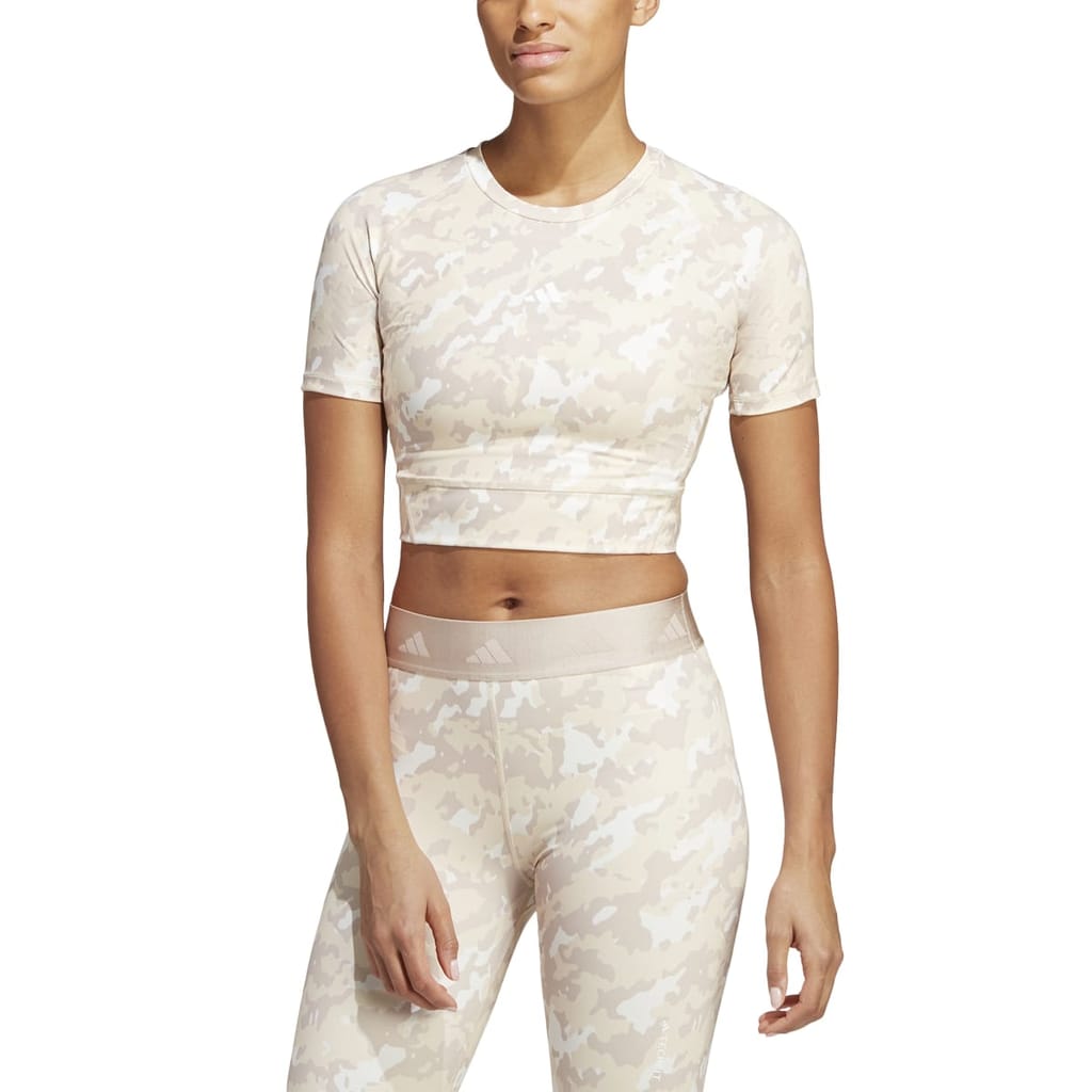 Womens adidas Techfit Camo Print Crop Training T-Shirt in wonder taupe.