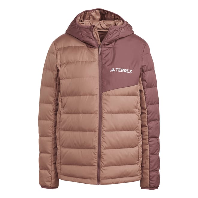 Womens adidas Terrex Multi Light Down Hooded Jacket in warm clay / burgundy.