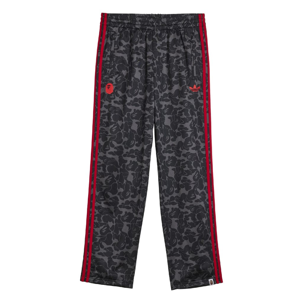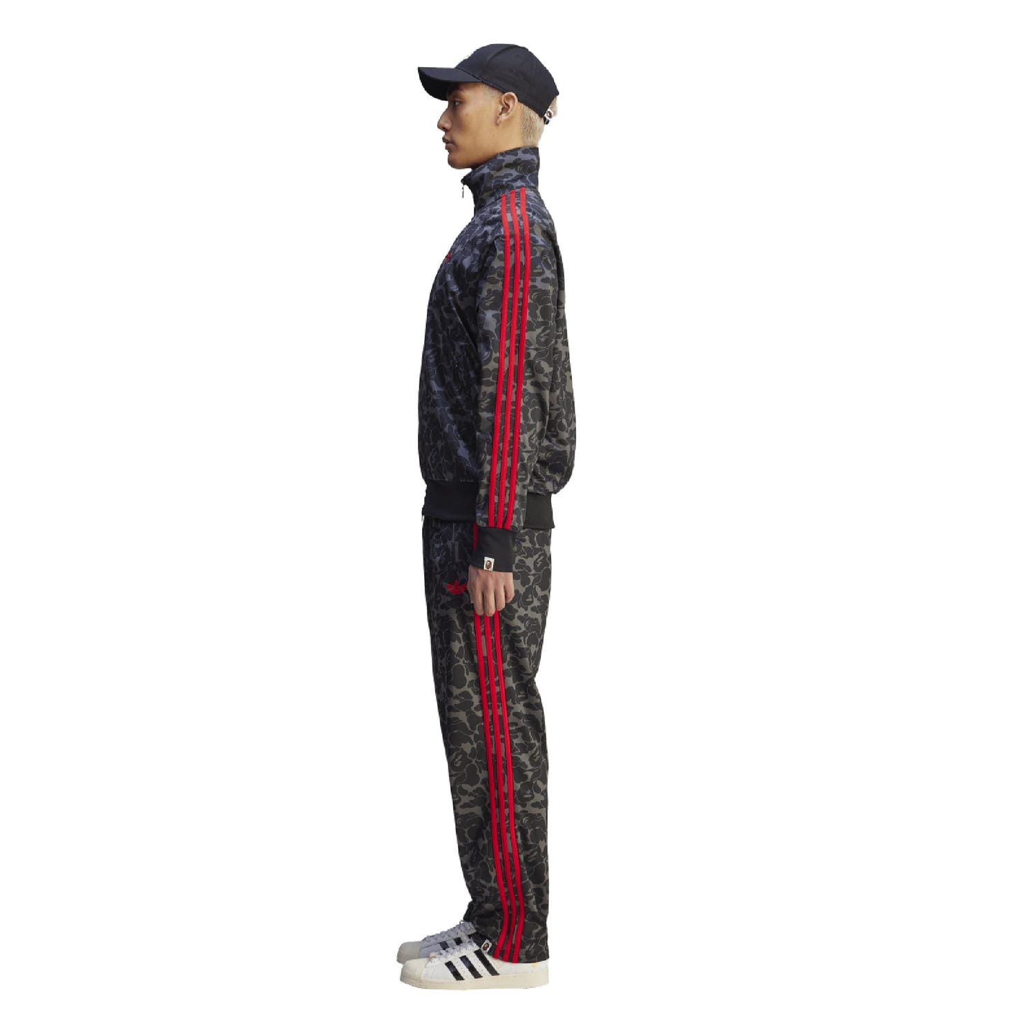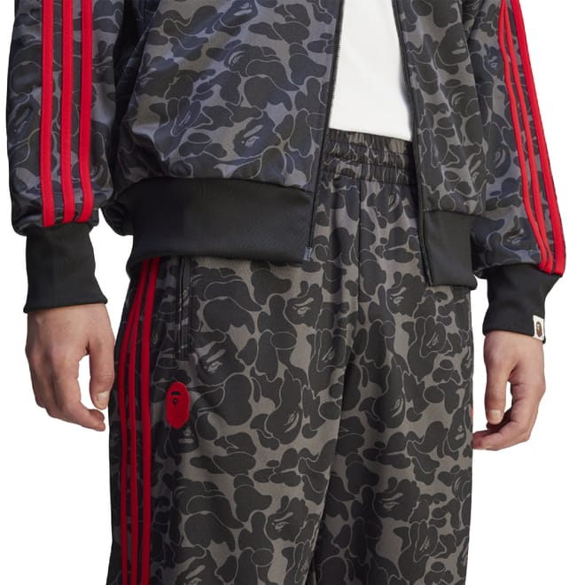 adidas x A Bathing Ape revisit some of culture's most impactful moments to inform these adidas track pants. Inspired by a landmark time in '80s hip-hop and infused with adidas Originals blue, the jacket also gets done up with a BAPE® solid camo allover print. Graphics and branding can be found throughout — 3-Stripes on the side, a special print on the back and Ape Head and Trefoil sign-offs on the chest. -
