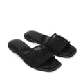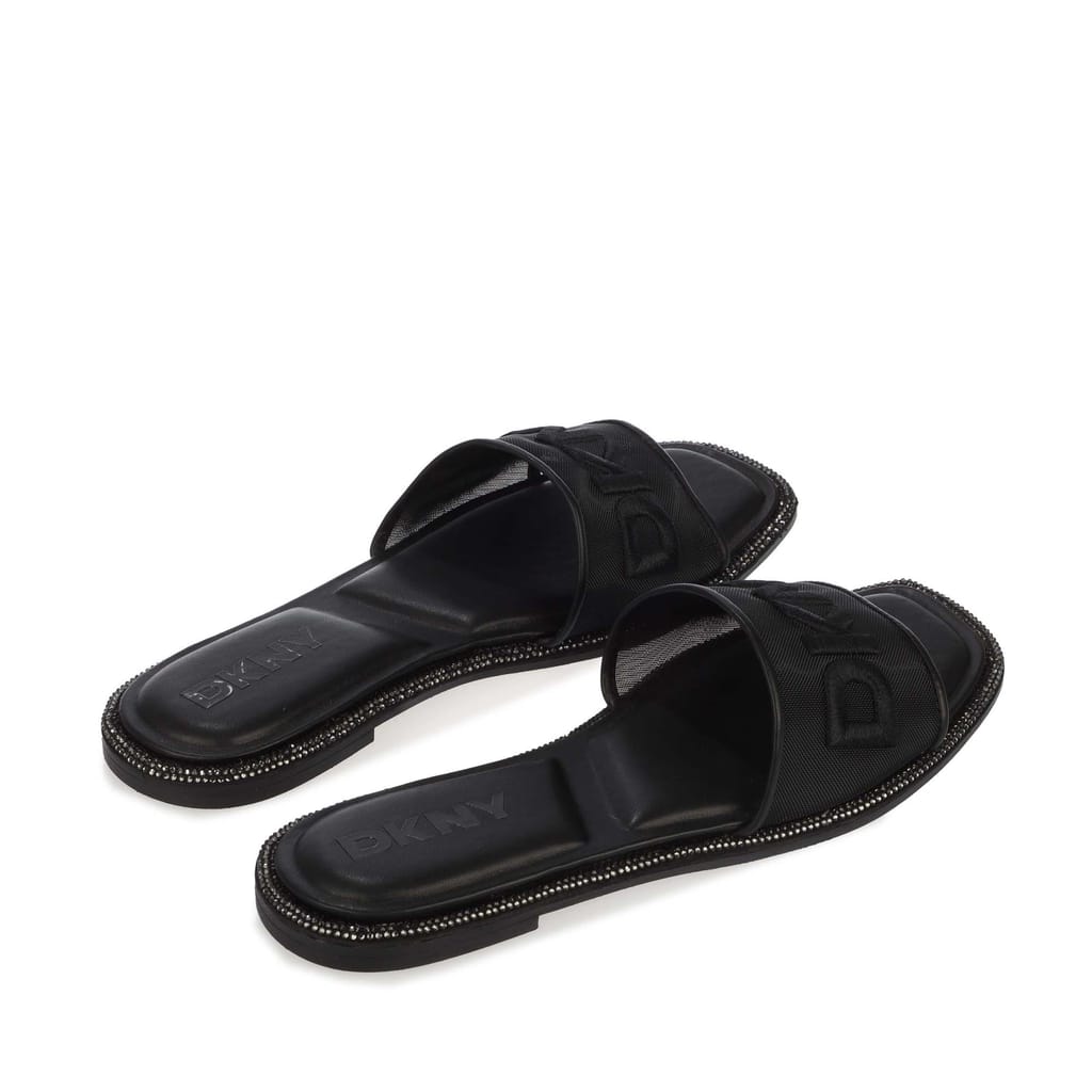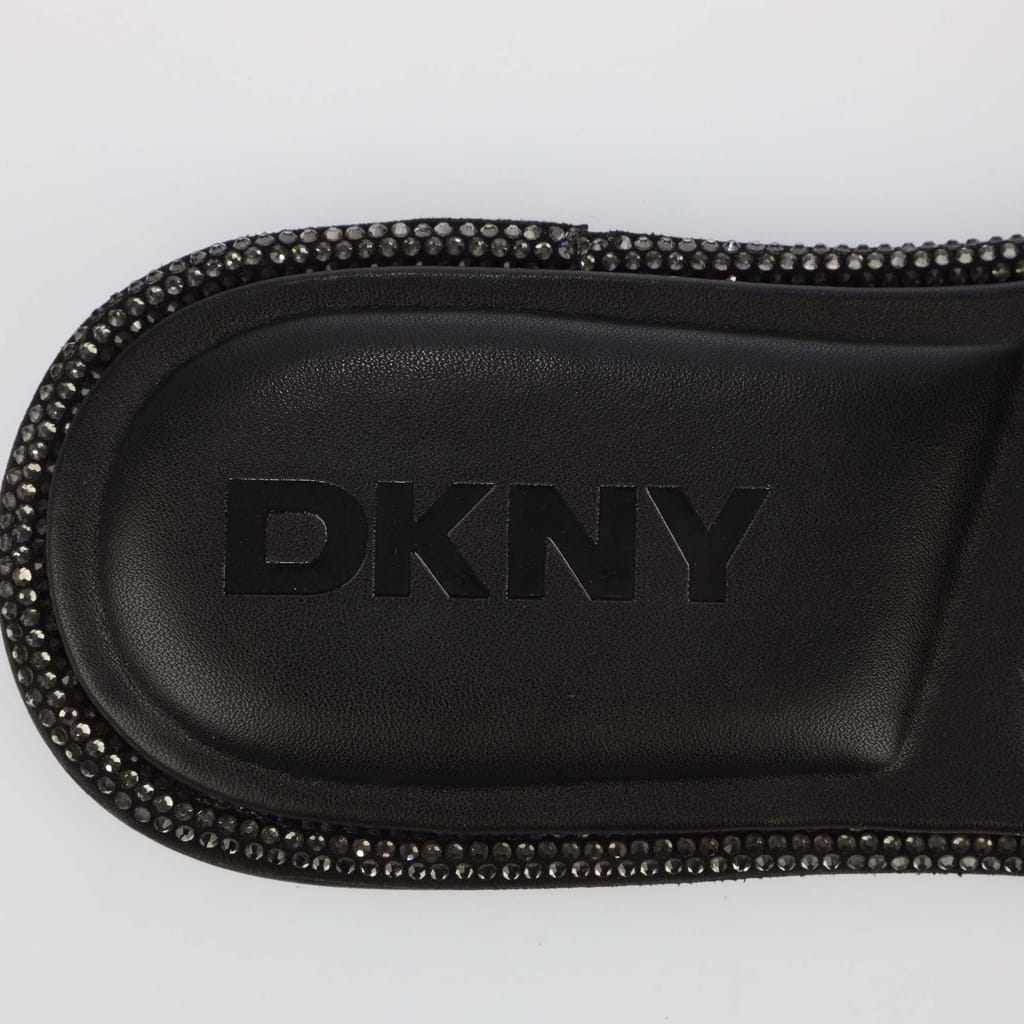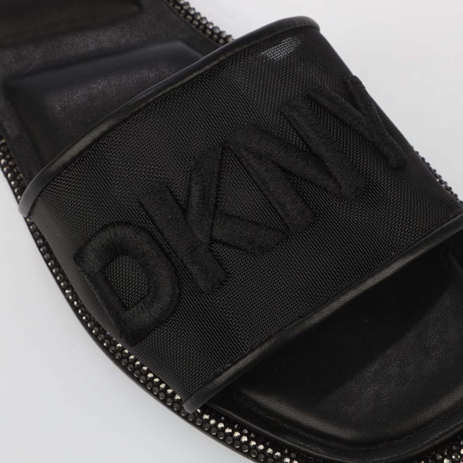 Womens DKNY Badin Logo Flat Sandals in black.