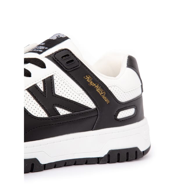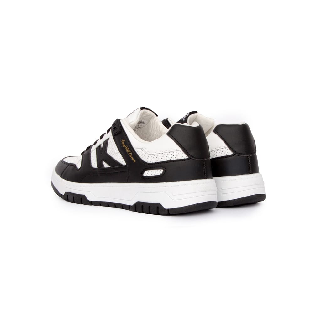 PU leather upper. Lace up fastening. Low-top. Debossed (sunken) "K" logo branding and wide flat laces. Rubber sole. -
