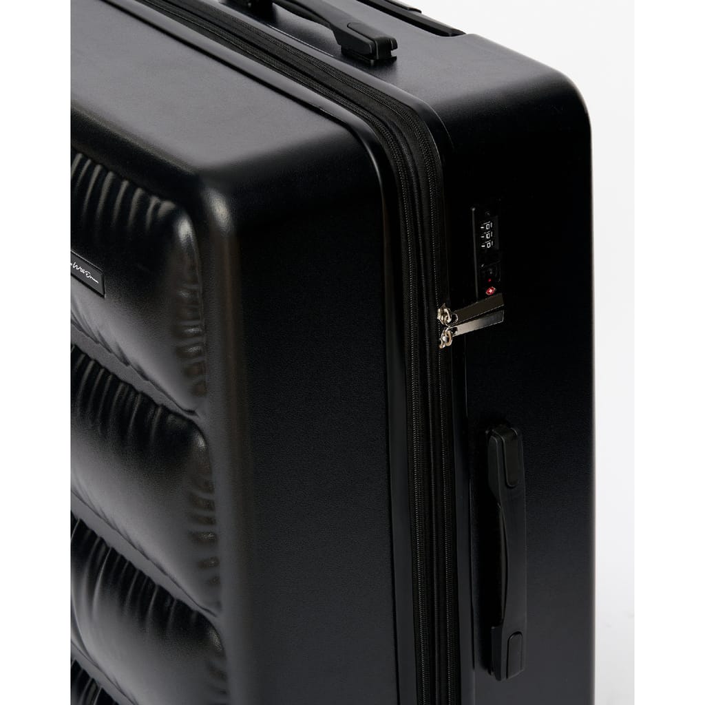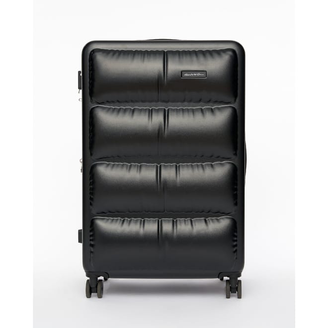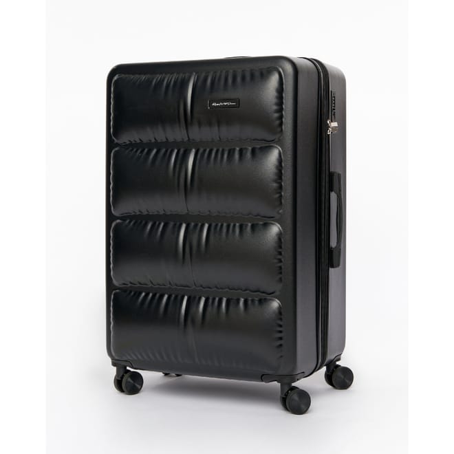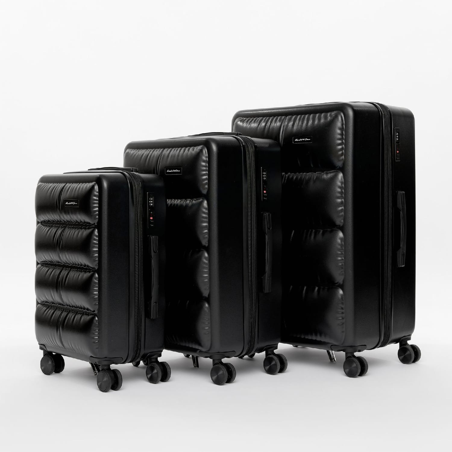 They typically feature 360-degree rotating wheels, an adjustable ergonomic handle, and interior compartments with mesh areas and X-fixed straps for organization. Hard-shell with a unique quilted, "puffy" look, 4 spinner wheels, and side-mounted locks. Made from environmentally friendly PC (Polycarbonate) or ABS materials, which makes them lightweight yet durable. -