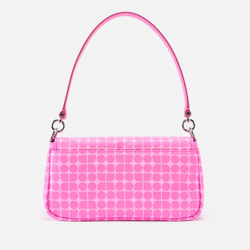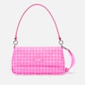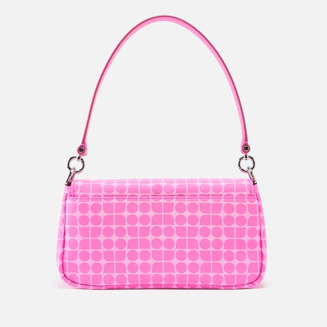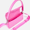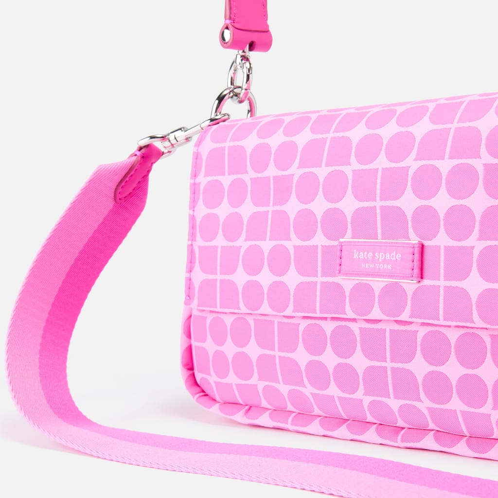 The bag has a magnetic snap flap closure, an interior zip pocket, and an adjustable, removable crossbody strap. It comes with both a top handle and a shoulder strap for versatile wear. The bag features a tonal pink jacquard pattern with silver-tone hardware. It is made from recycled polyester with leather trim. -
