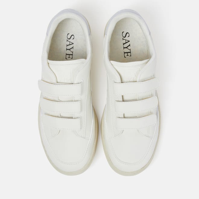 Low-top retro-inspired sneakers featuring adjustable hook-and-loop (Velcro) straps.The upper is crafted with corn vegan napa, a bio-based alternative to traditional leather, and the interior uses soft bamboo and recycled PET from plastic waste. Rubber sole. -