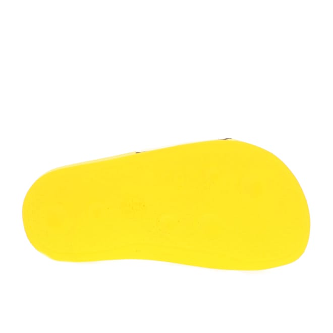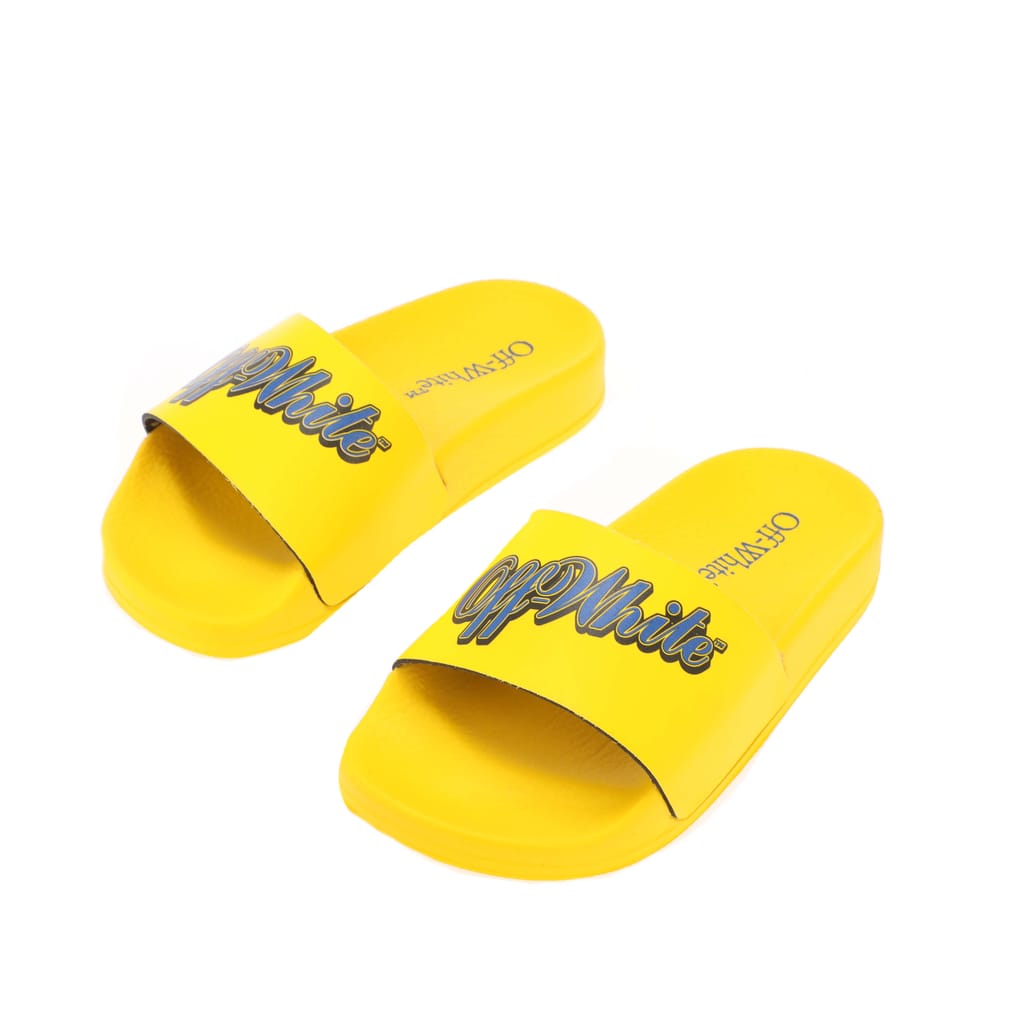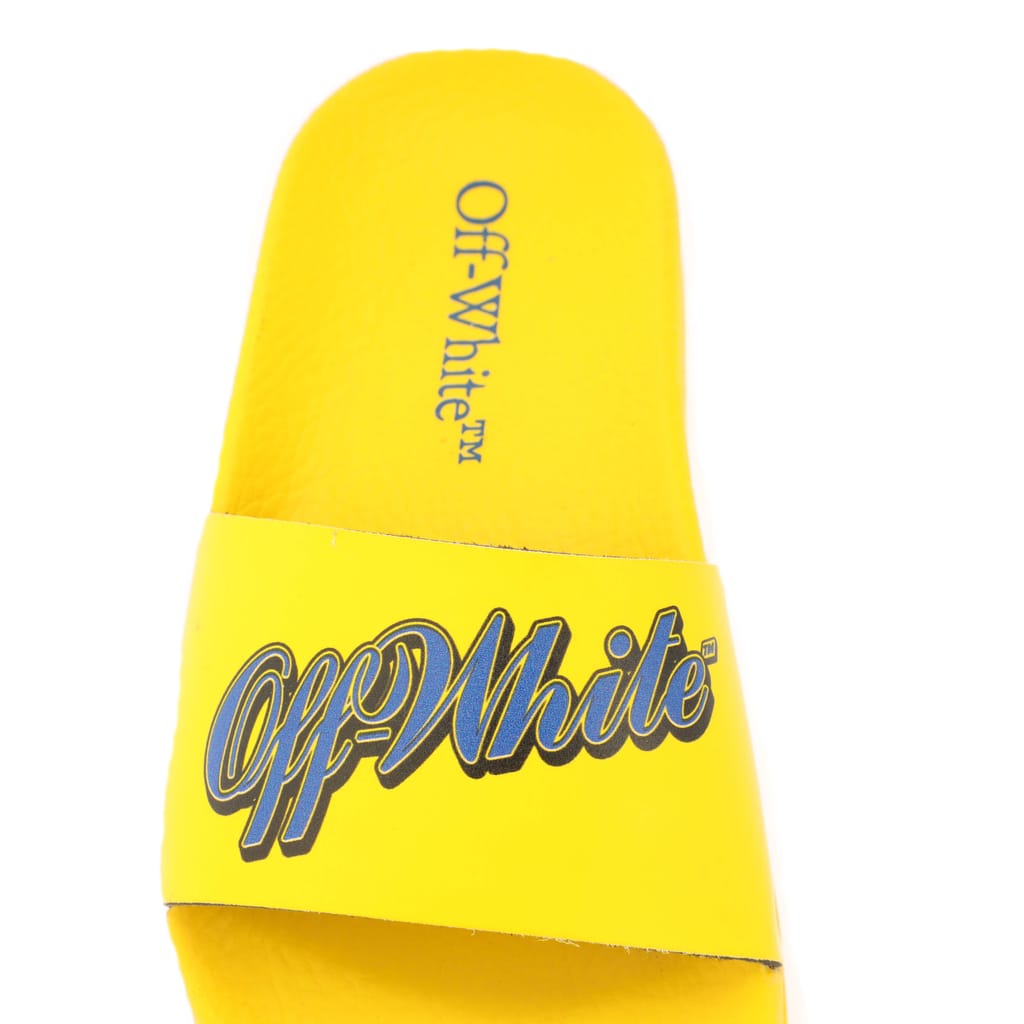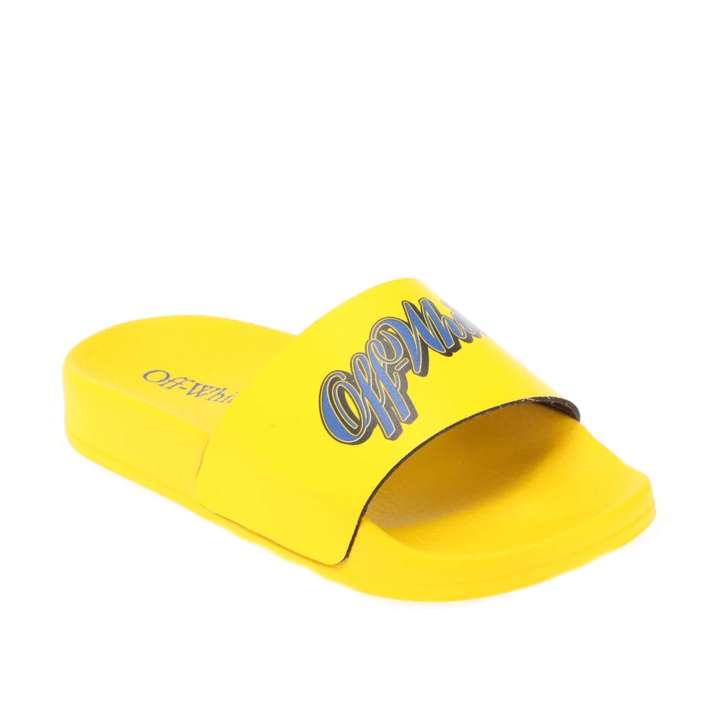 Juniors Off White Pool Sliders in yellow blue.