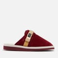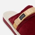Suede upper with webbing trim strap. Slip-on mule construction. Adjustable hook-and-loop (Velcro) strap fastening with a woven logo patch. Molded Vibram foam rubber footbed. Chunky treaded Vibram rubber sole. -