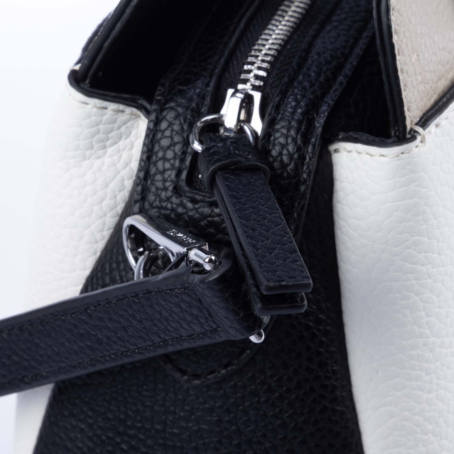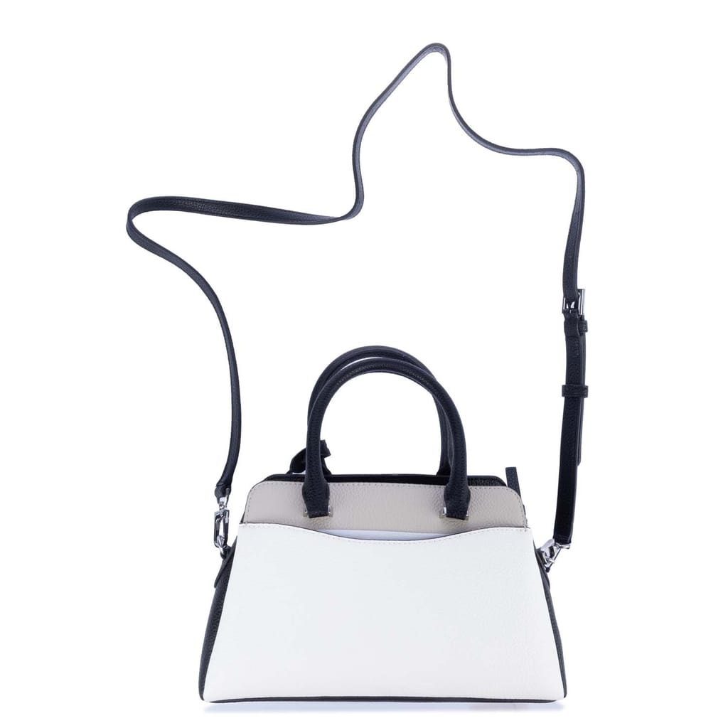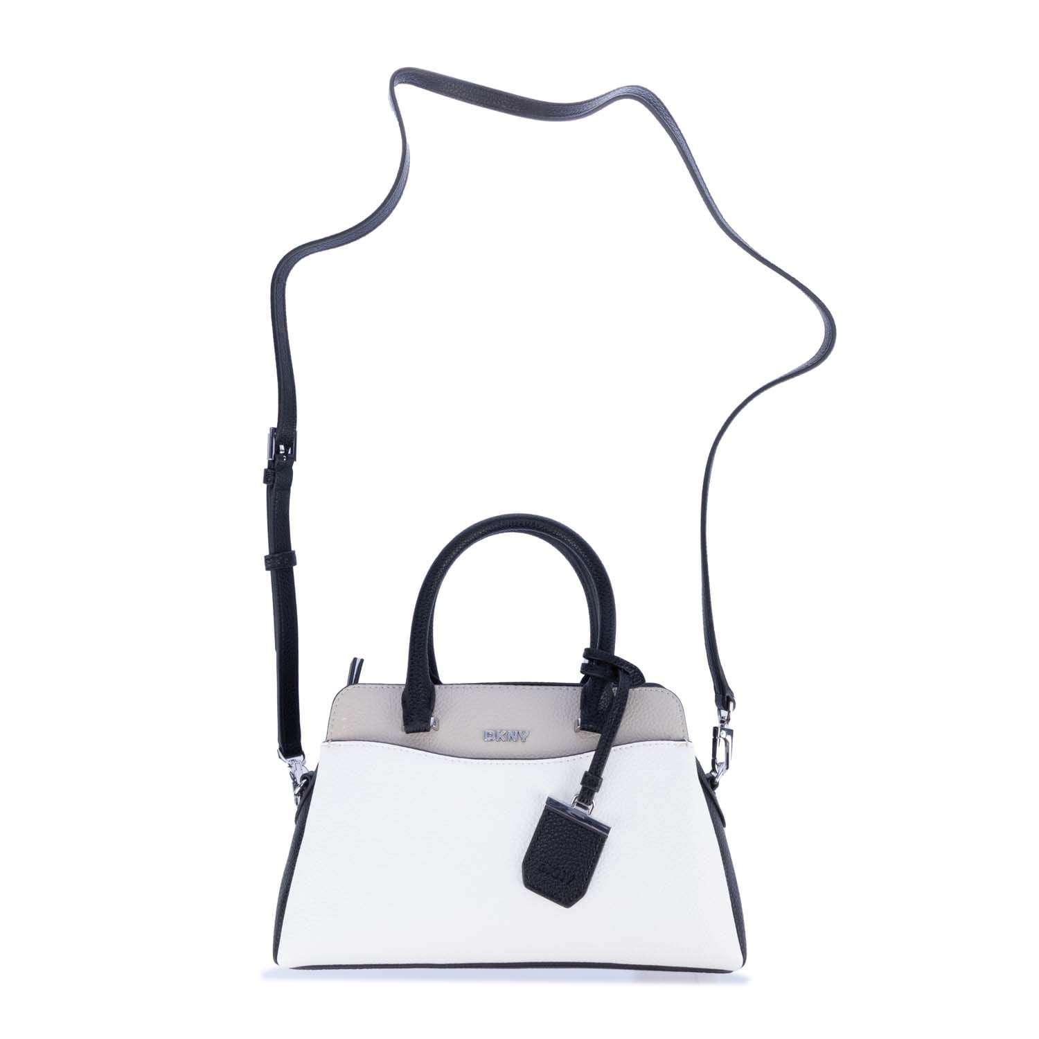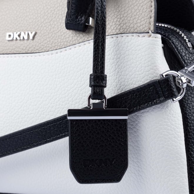 Comes with detachable strap so it can be worn as a crossbody bag. W at base: 10.5 x H: 7 x D: 4 Logo accents and a classic shape make the DKNY small leather satchel a chic choice for everyday designer style. 3 L handles; 21-1/2 L adjustable detachable strap. Zip closure. Silver-tone exterior hardware. 1 interior middle zip pocket, 2 inside open pockets, 1 outside pocket. -