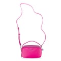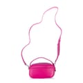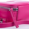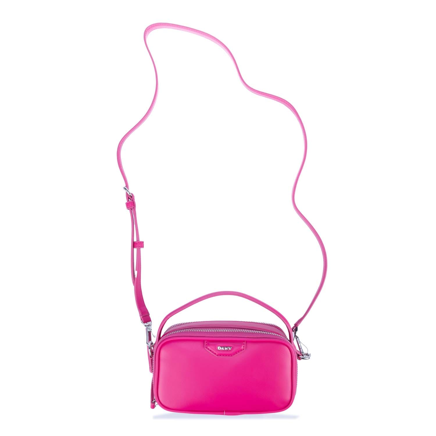Adjustable strap. Two main zip compartments. Metal DKNY logo plaque on the front. Open back pocket. One interior pocket. -