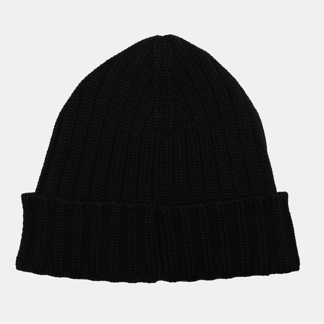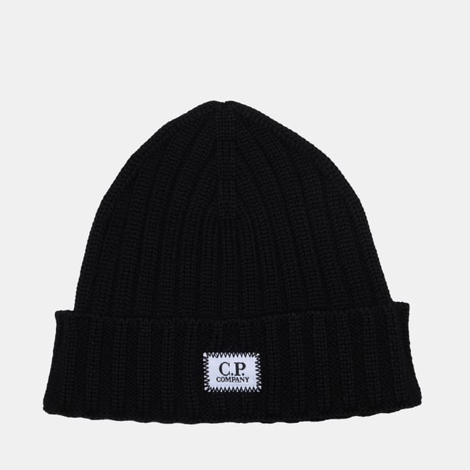 C.P. Company Extra Fine Merino Wool Logo Beanie in black.