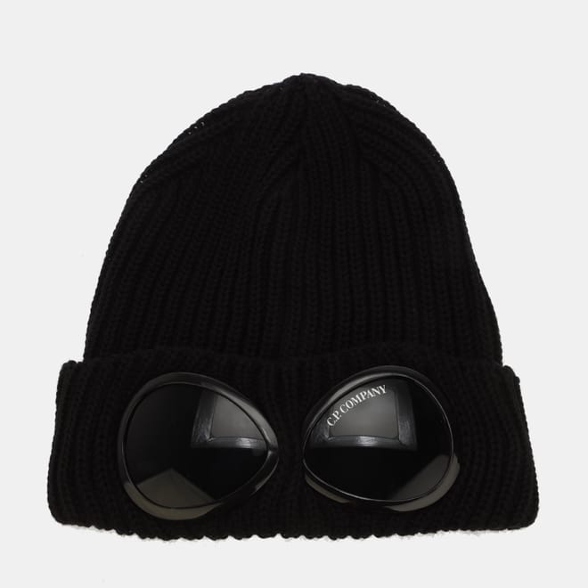 Mens C.P. Company Extrafine Merino Wool Goggle Beanie in black.