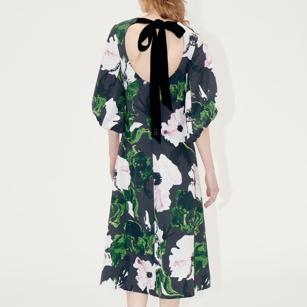 It is a mid-length dress featuring a V-neck, oversized elbow-length sleeves with elasticated cuffs, and a floral pattern. The dress is made from 96% recycled polyester and 4% elastane. It has a concealed rear hook and zip fastening, as well as a rear tie fastening. The dress contains 95% recycled material. -