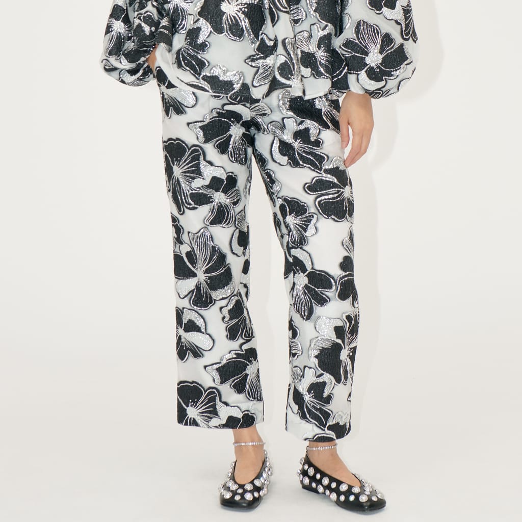 Straight-leg pants with a high waist and a floral pattern on a ribbed material. -