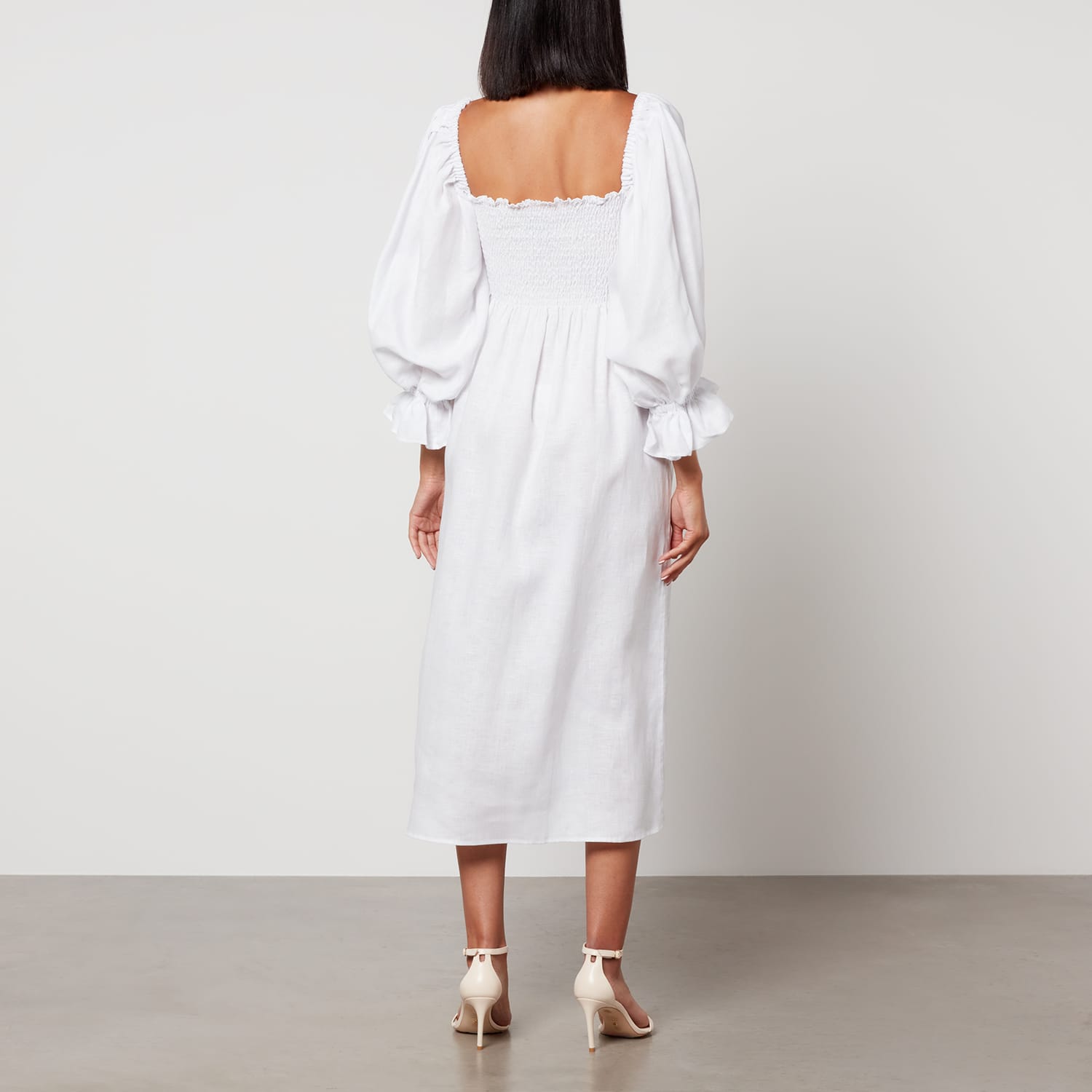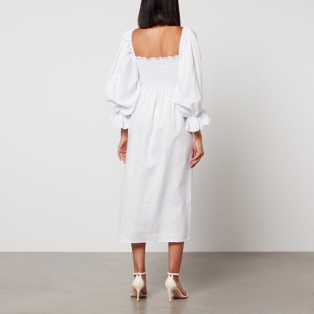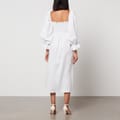 It is a midi-length smocked dress with a square neckline, and features voluminous puff sleeves with ruffle cuffs. The smocked bodice and elasticated sleeves allow it to be worn on or off the shoulder. -