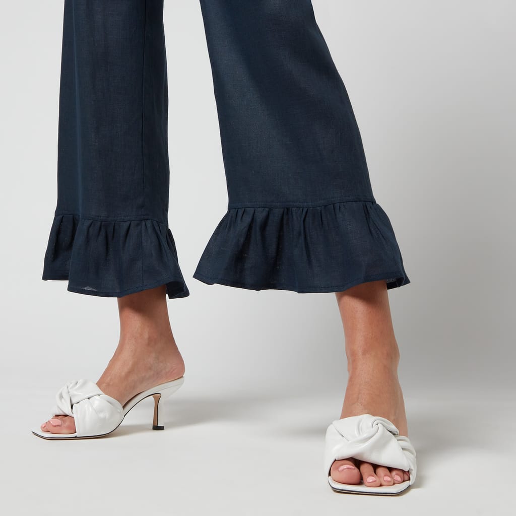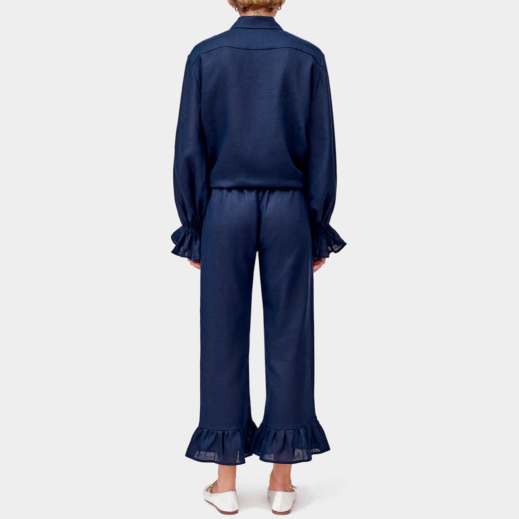This is a two-piece pyjama set made of linen, featuring a tie-front shirt with ruffled cuffs and ankle-length trousers with ruffled hems. -