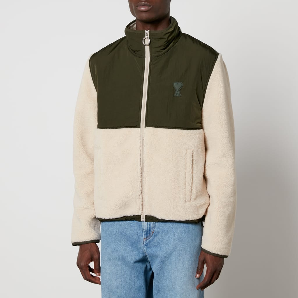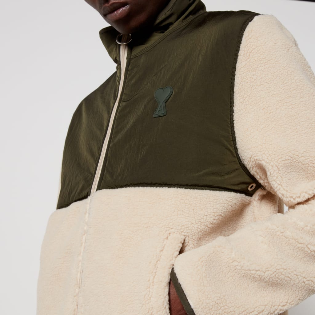 Funnel neck. Front zip fastening. Two side zip-fastening pockets. Color-block design. Embroidered Ami de Cœur logo on the chest. Paneled polyester-blend sherpa fleece and nylon taffeta. -