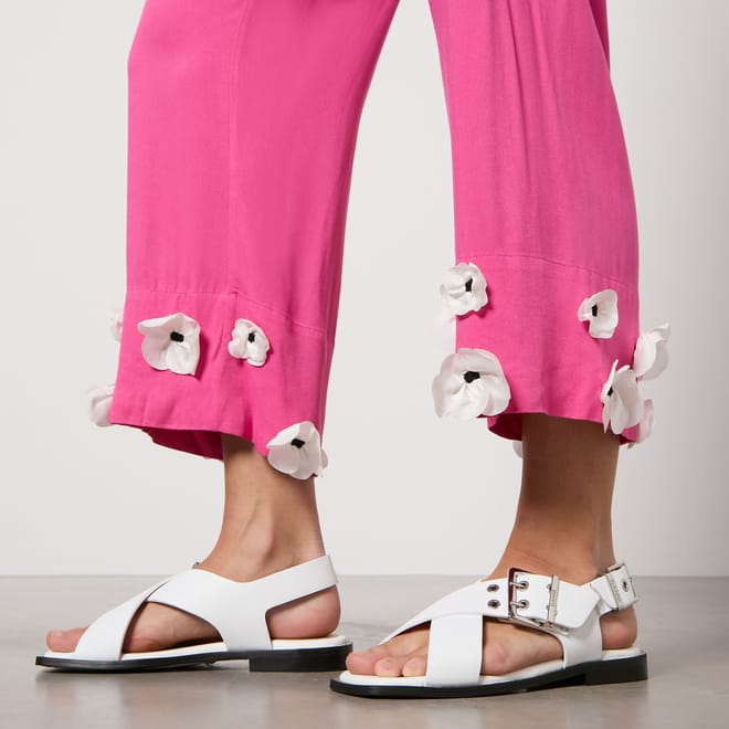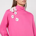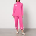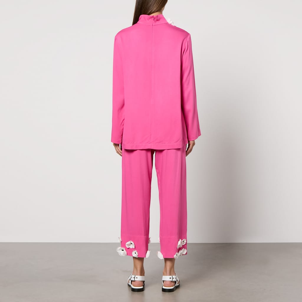The set consists of a pink long-sleeved top with a high neckline and matching cropped wide-leg trousers. Both pieces are embellished with white floral appliques. -