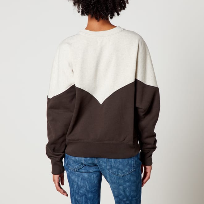It features a relaxed fit with a round neck, dropped shoulders, long sleeves, and ribbed trims. Two-tone design and a flocked "Marant" logo across the chest. -