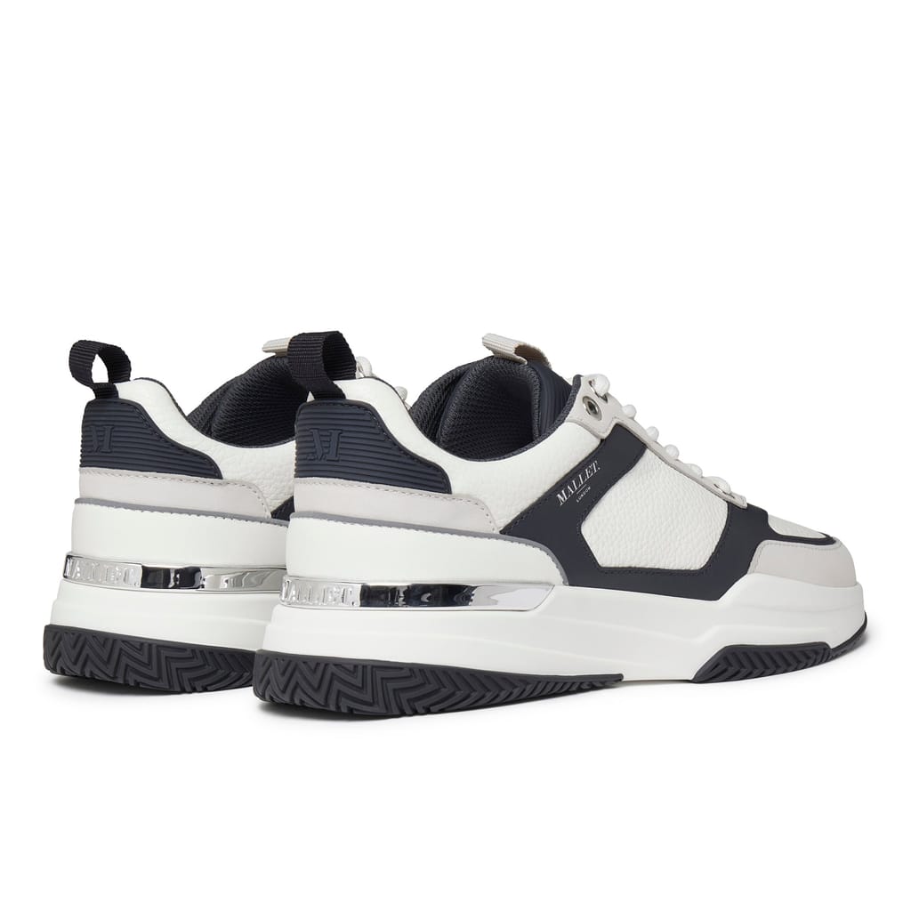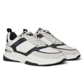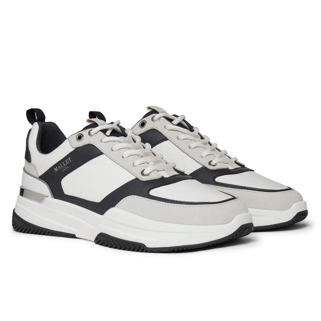 The Radnor White Black trainers combine sleek contrasts with premium materials for a contemporary look. Featuring breathable light grey diamond mesh underlays, soft black suede midlays, and layered white leather and light grey nubuck overlays. Designed for comfort with a light grey honeycomb mesh collar, white PVC tongue tab, and black PVC heel counter. Black and light grey gross grain webbing tabs add texture, complemented by black reflective piping on the heel. Finished with white waxed cotton laces with gloss black lace ends, gloss black eyelets, and a breathable white mesh lining with leather insock. The sole features a white midsole, black outsole tread, and a glossy black TPU heel clip for style and durability. -