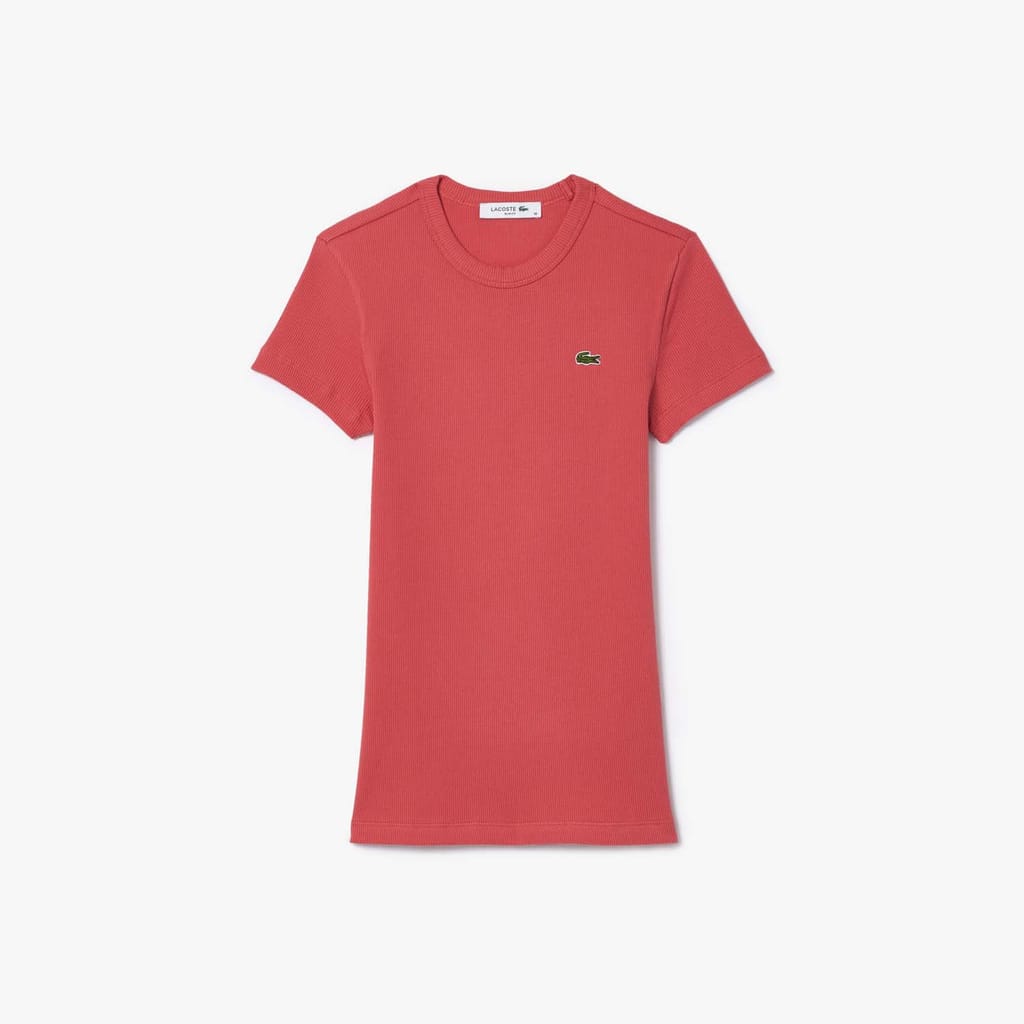 Womens Lacoste Slim Fit Ribbed Cotton T-Shirt in pink.