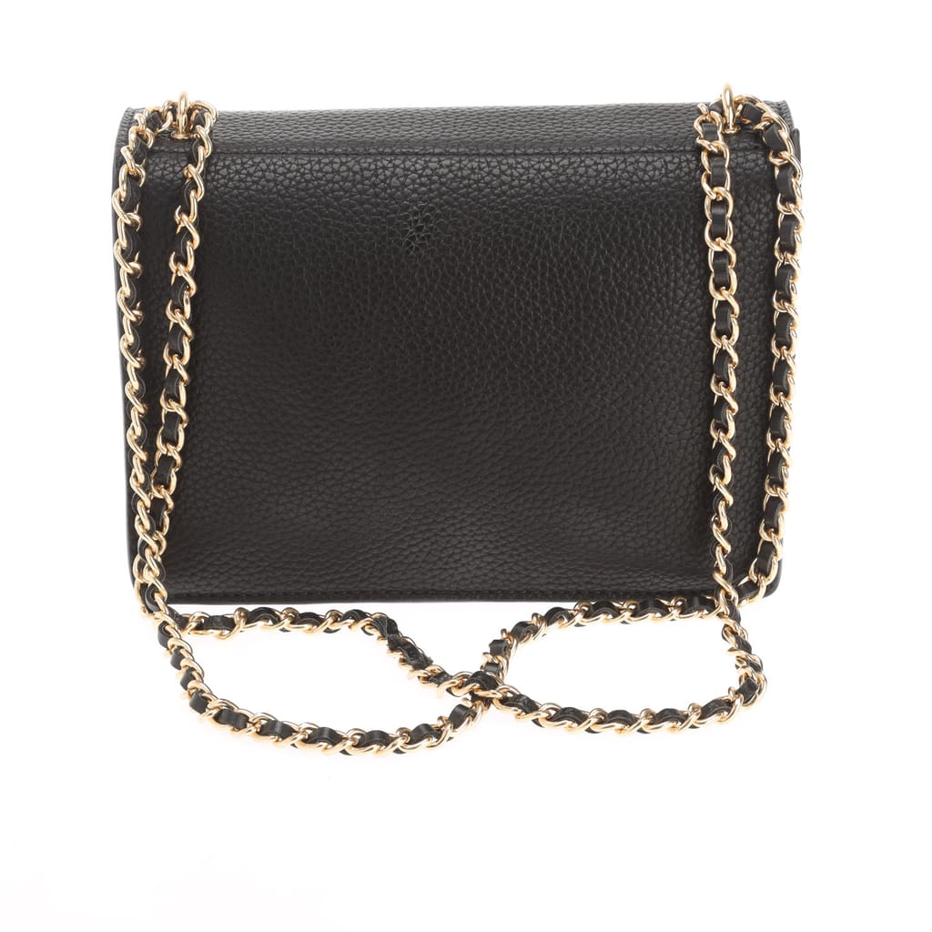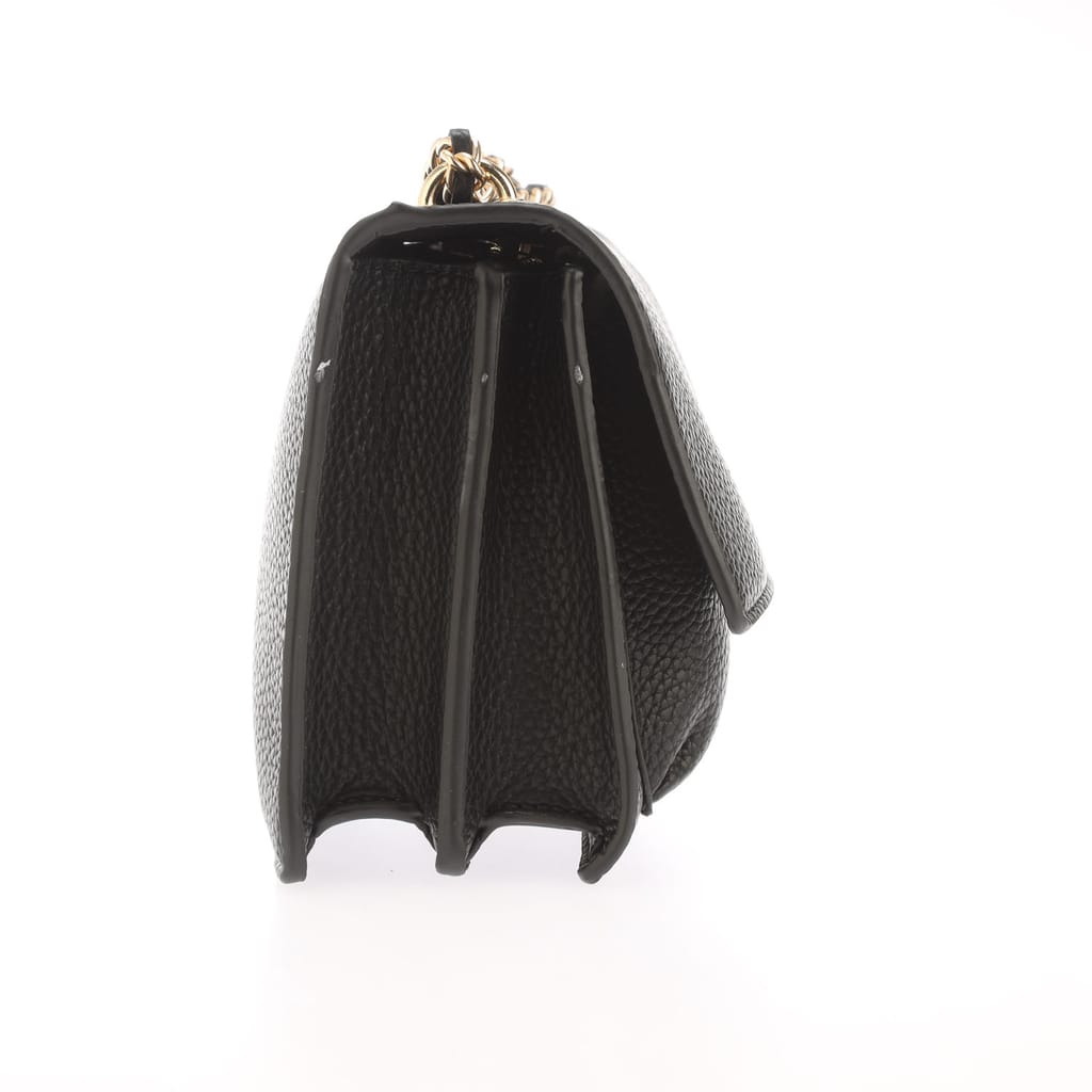 Gold-toned hardware, including a chain strap and branding.