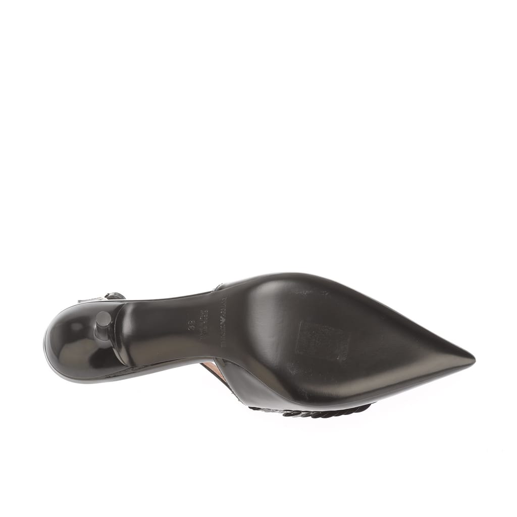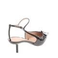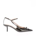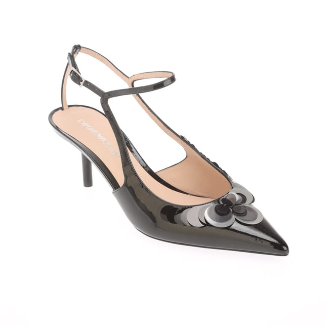 Pointed toe, a kitten heel, and an adjustable slingback ankle strap. Decorative flower embellishment on the toe. -