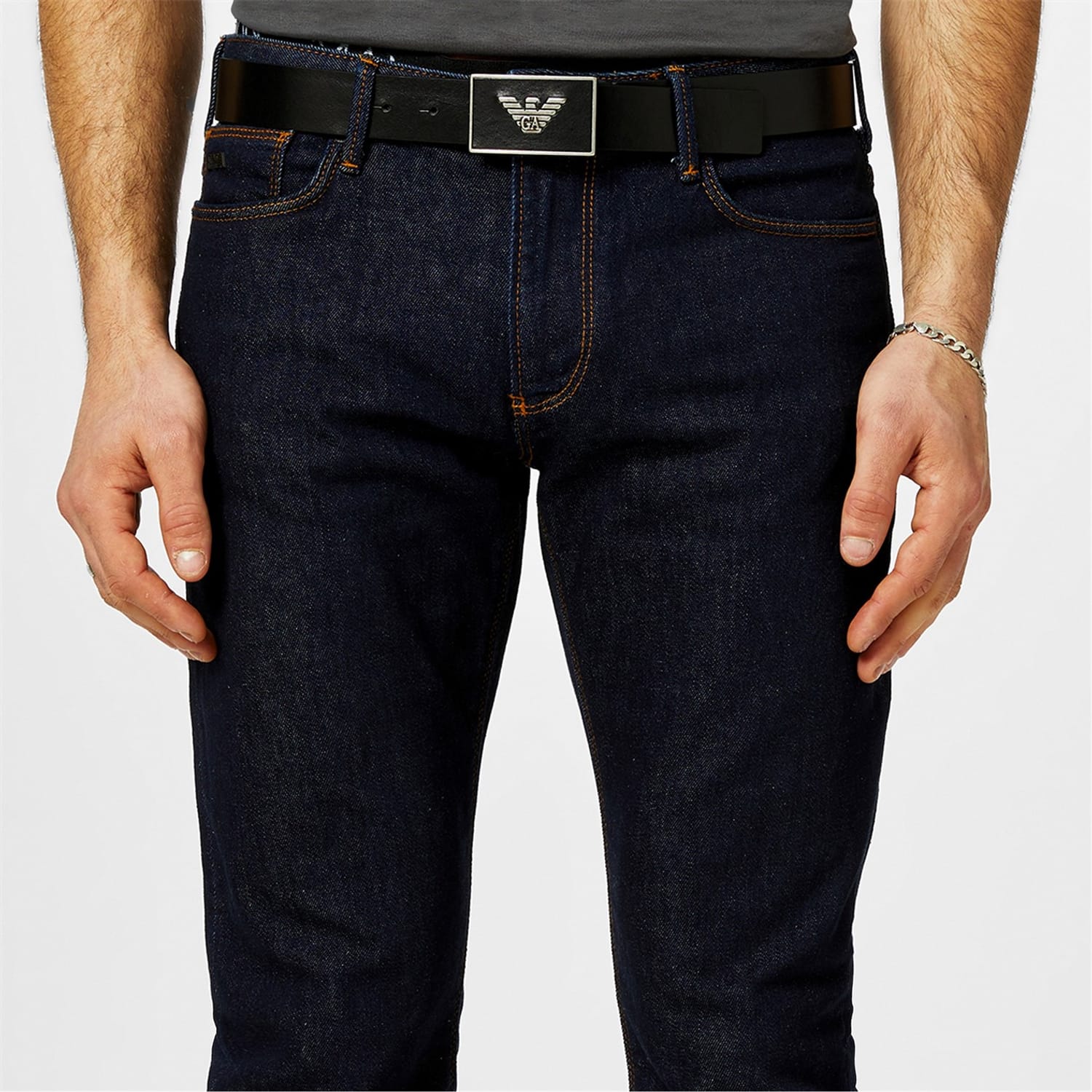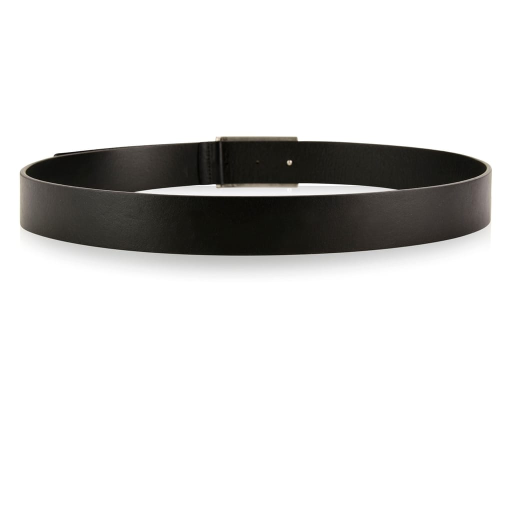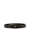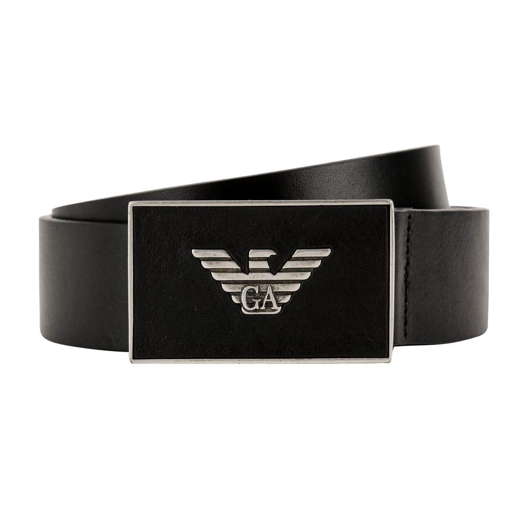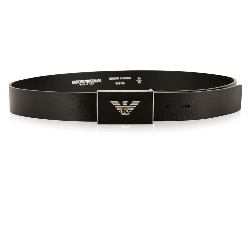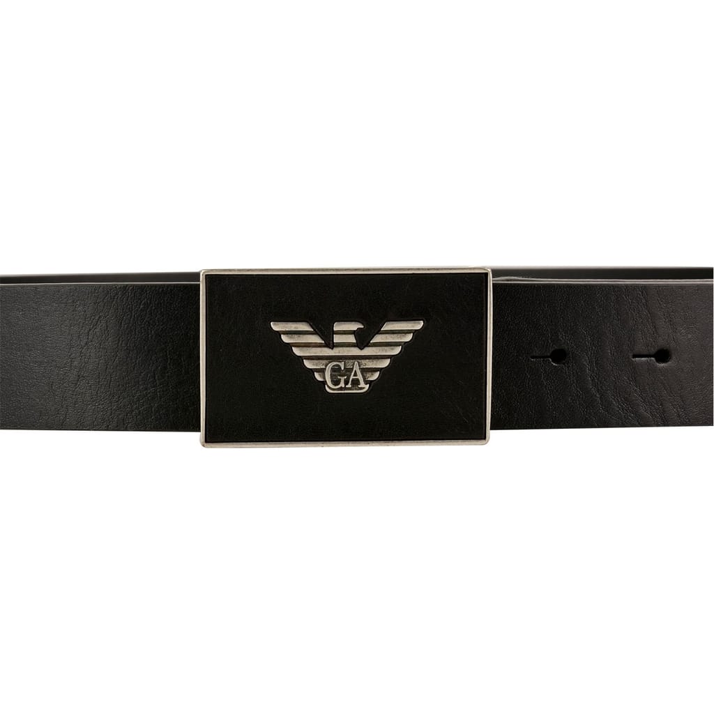 Finish your everyday style with this logo plate belt from Emporio Armani. Crafted in smooth leather composition this style features a metal plate buckle adorned with the signature eagle logo. Dimensions approximately:Width: 3.5cm. -