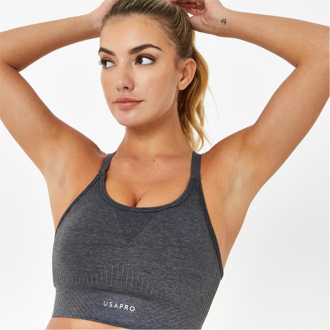 - Crafted from a blend of Nylon and Elastane for a stretchy fit, this cropped silhouette offers ultimate comfort during those intense workouts. Designed with seamless technology to ensure an irritation-free experience no matter your yoga position, the removable cups provide customisable support and shape, catering to your individual needs. Designed with the Pro Dry technology, this bra effectively wicks away sweat, keeping you dry and comfortable during intense workouts. Accompanied with adjustable cross-over straps to the rear for additional and customisable support, USA Pro branding showcases your dedication to performance and style.