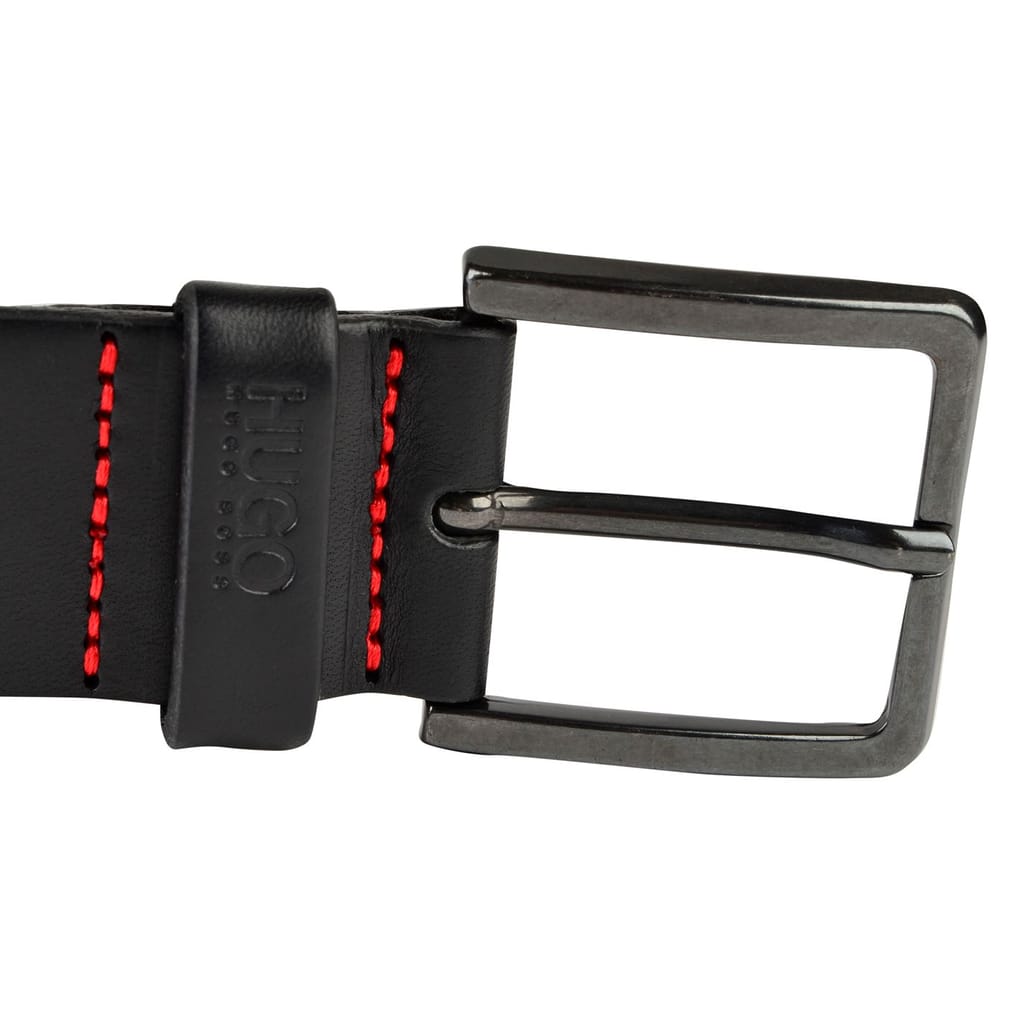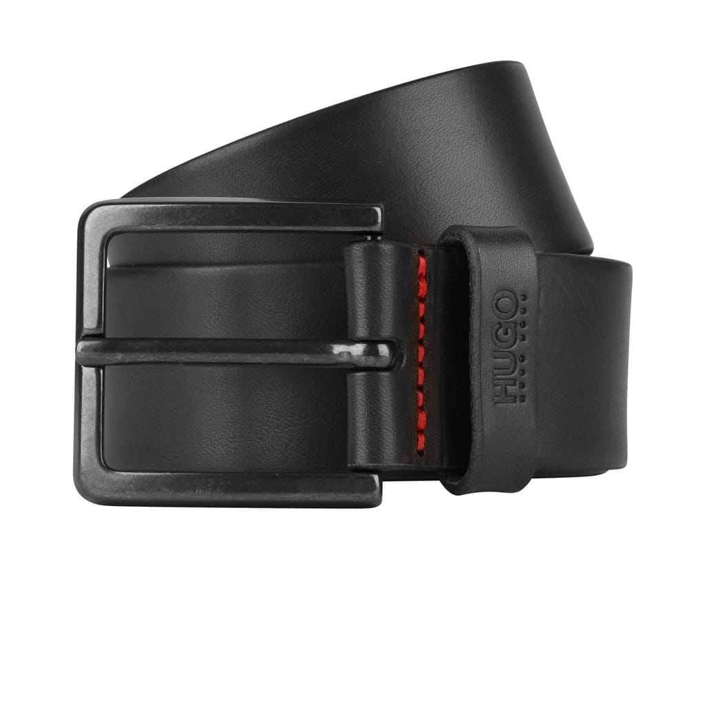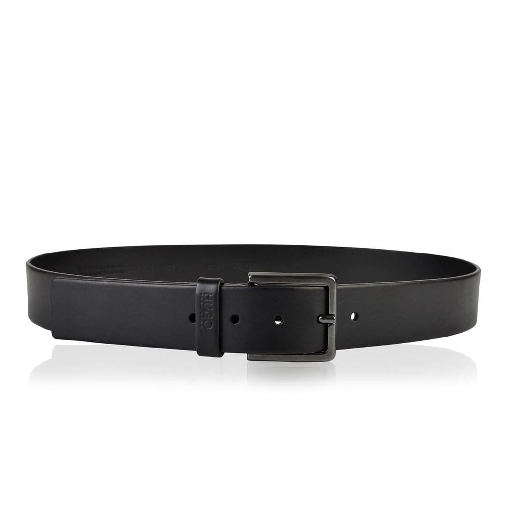 Accent your off-duty look with this Hugo Giono belt from Hugo Boss. Defined by the matte gunmetal finish hardware, this versatile piece is crafted from refined leather for maximum durability and style. Partially lined, it is finished with an embossed brand logo detailing to lend a sophisticated appeal. Complete your causal denim jeans and t-shirt combo with this distinctive piece and elevate your look instantly.- Buckle