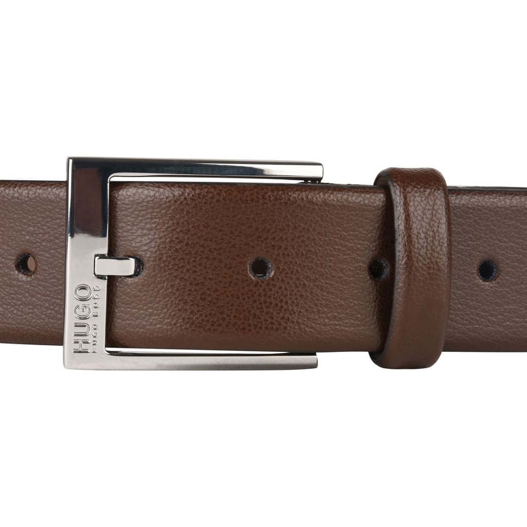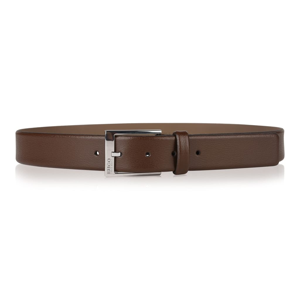 Hugo BeltsAdd a contemporary twist to your tailored ensembles with this Hugo Gellot belt from Hugo. Featuring polished silver-hued hardware, this piece is created in the finest grainy, embossed leather material for a luxurious appeal. Finished with an engraved brand logo on the buckle, that can complement both your business wear and casual outfits. Purchase for a great variety of wear styles.