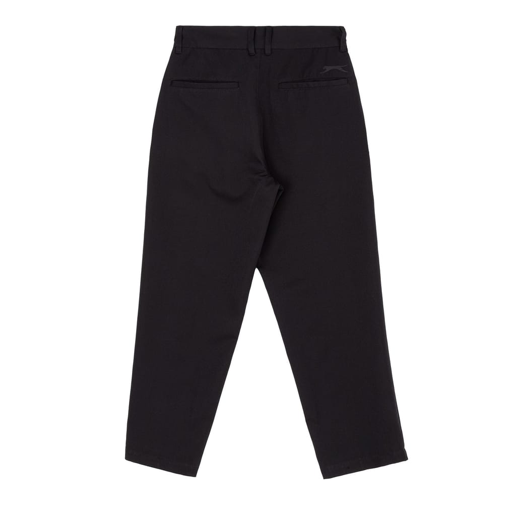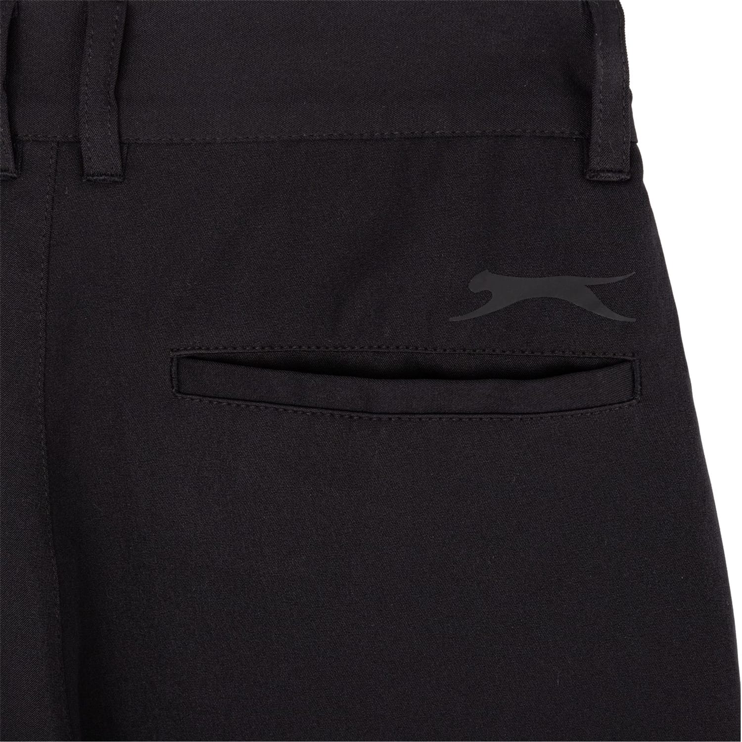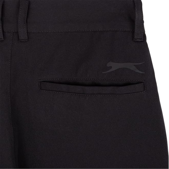- These Slazenger Golf Trousers are crafted with a single button fastening waist. They feature belt loops and also 4 open pockets. These trousers are a straight cut, light weight fastening waist and a zip fastening fly. They are a straight cut, lightweight construction. Solid colour design with an Slazenger branding.