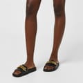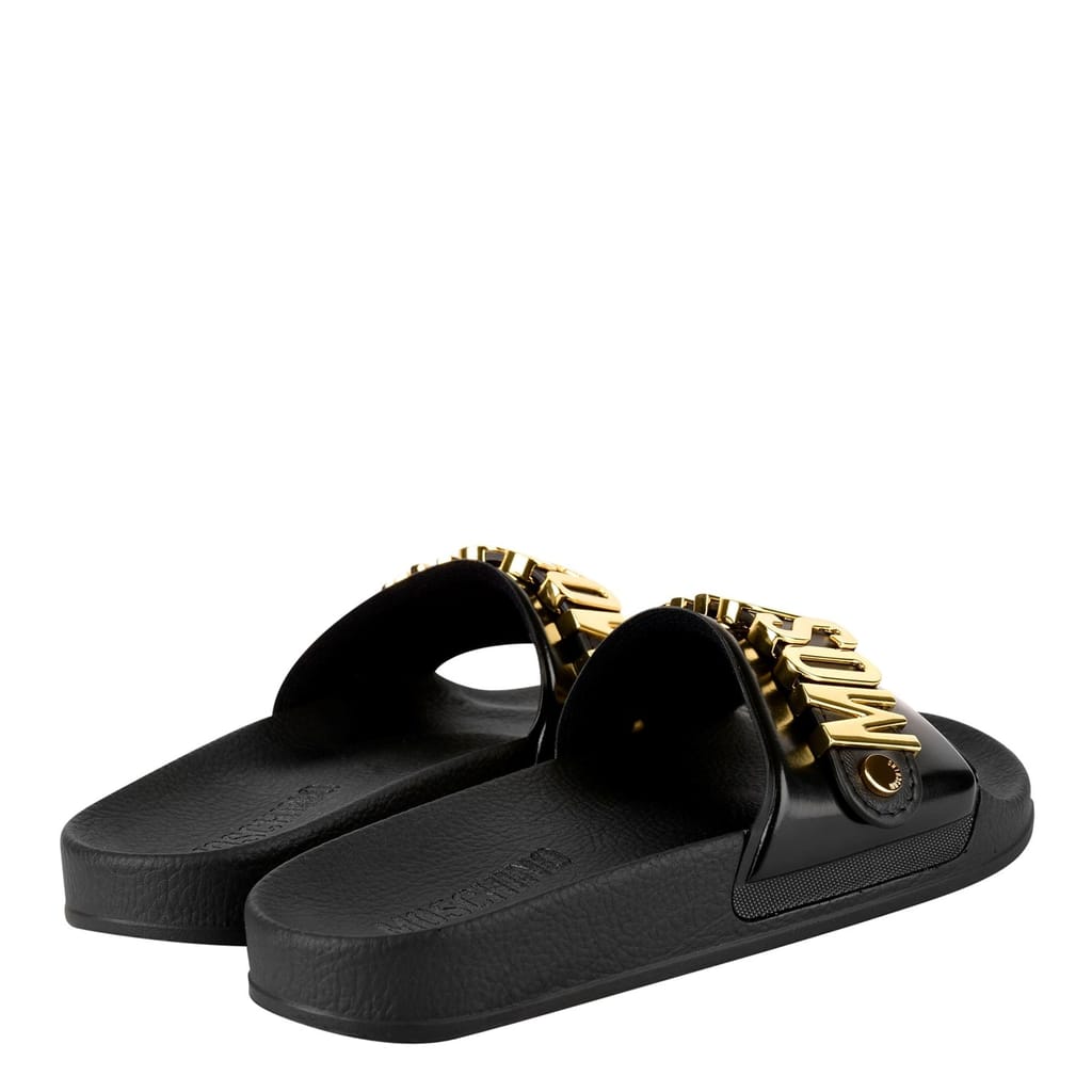 Get poolside ready with the logo pool sliders from Moschino. Constructed in the classic slip on design, this pair boast the brands familiar logo adorned to the upper in a gold tone 3D motif with a contrasting cushioned sole.